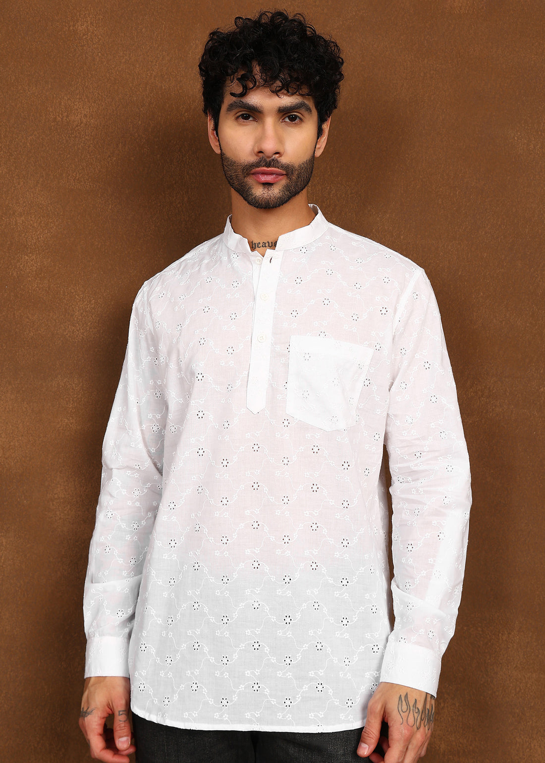 Elevate your everyday ethnic style with the Ivory Bloom Embroidered Short Kurta. Crafted from lightweight,...