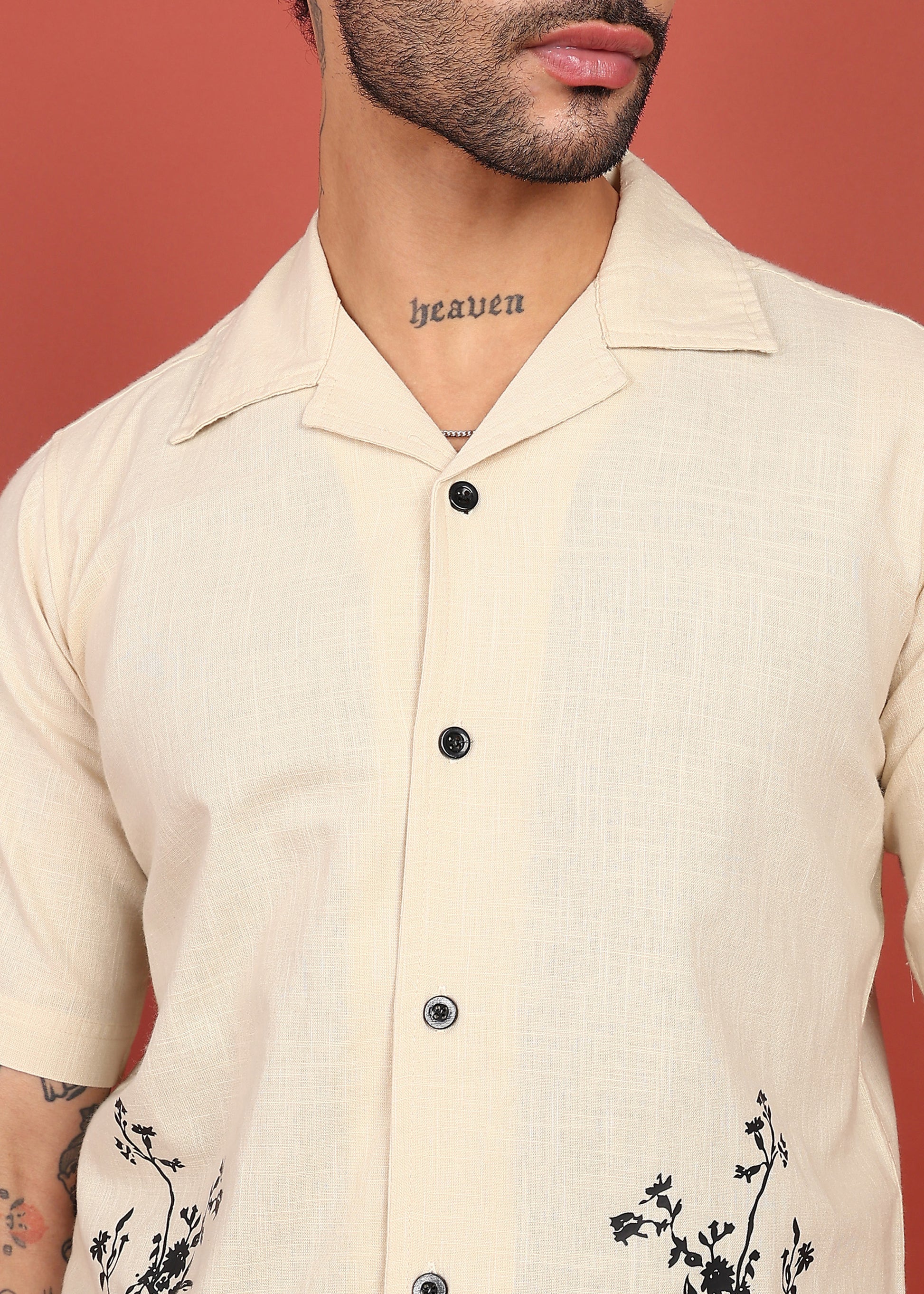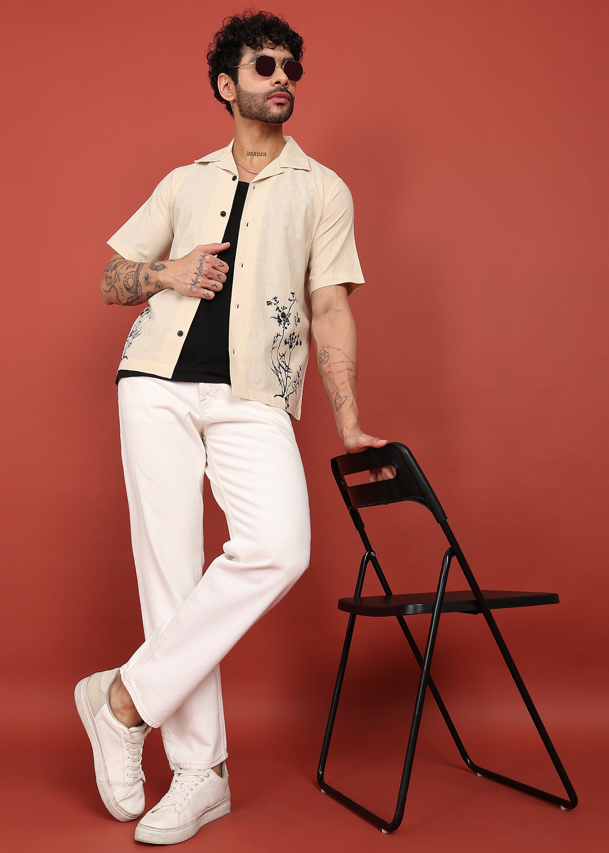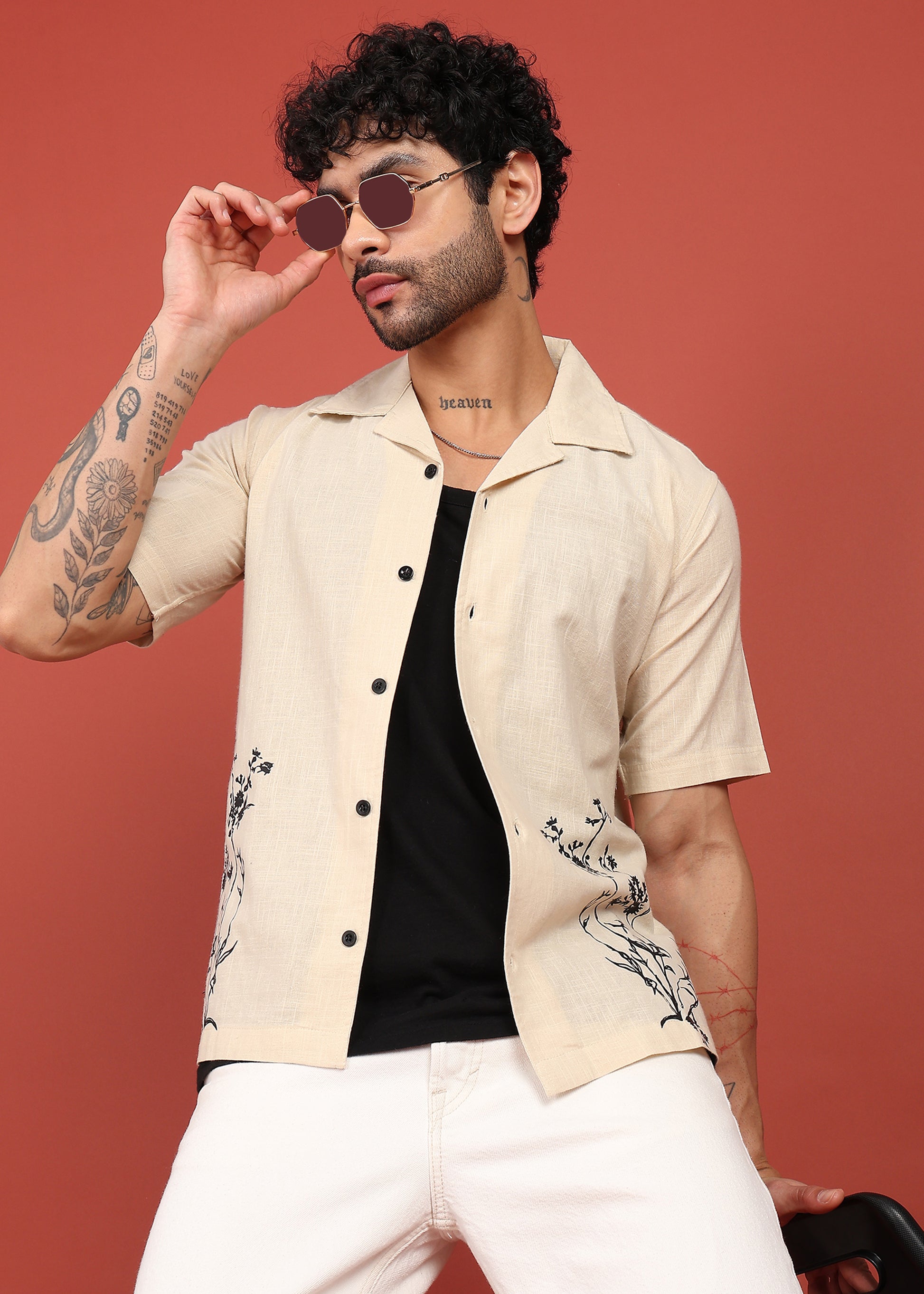 The Beige Bloom Embroidered Resort Shirt is crafted for effortless elegance with a modern edge. Made from a lightweight, breathable fabric, this shirt features delicate black floral embroidery along the hem, adding a refined artistic touch. The relaxed resort collar and clean button-down front make it perfect for summer outings, vacations, brunches, and evening get-togethers. Pair it with trousers, shorts, or linen pants for a polished yet laid-back look.