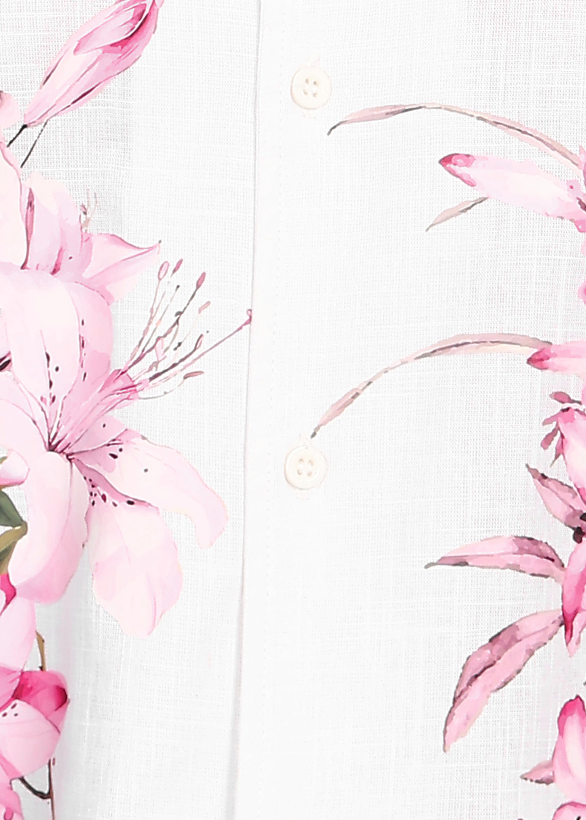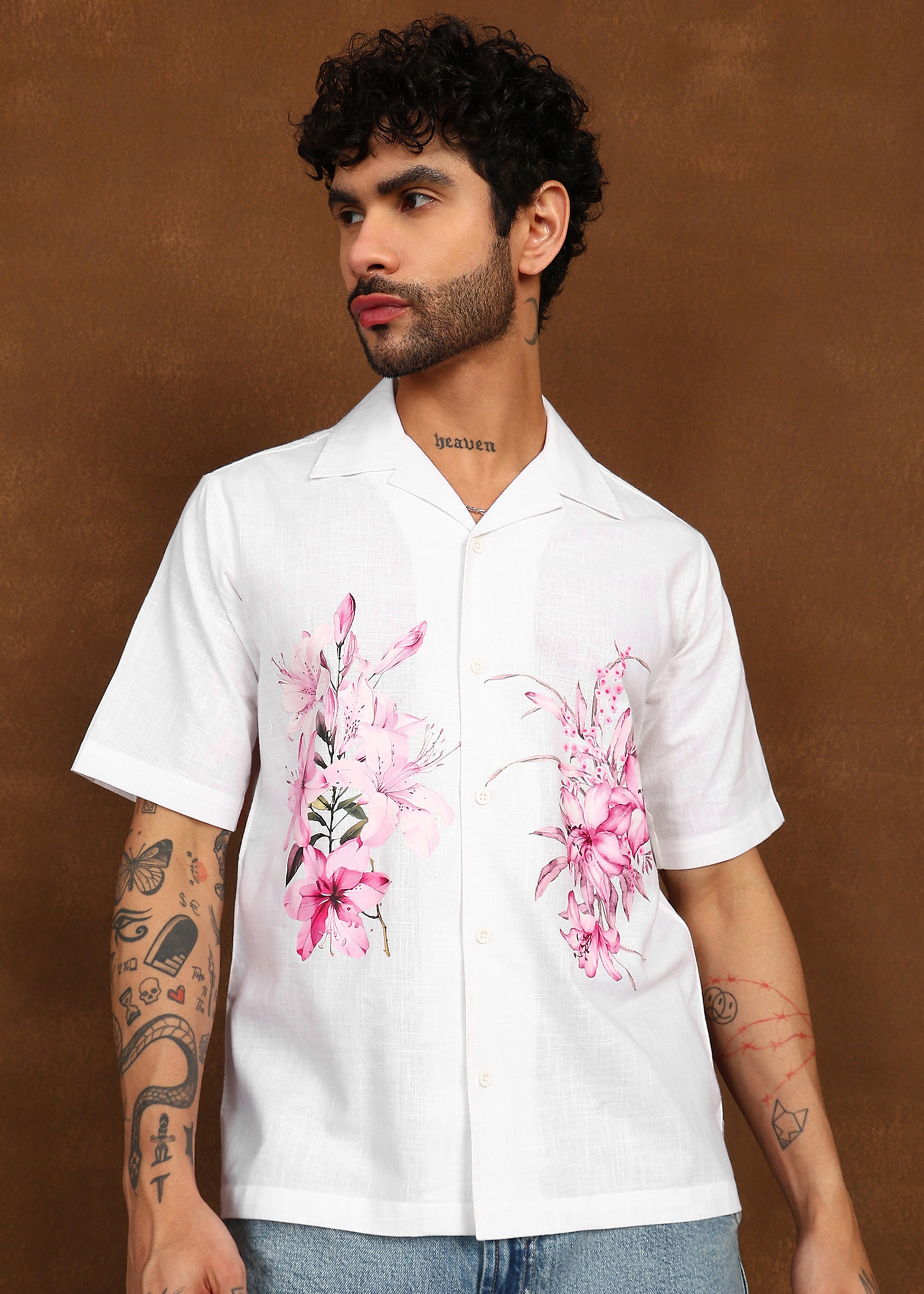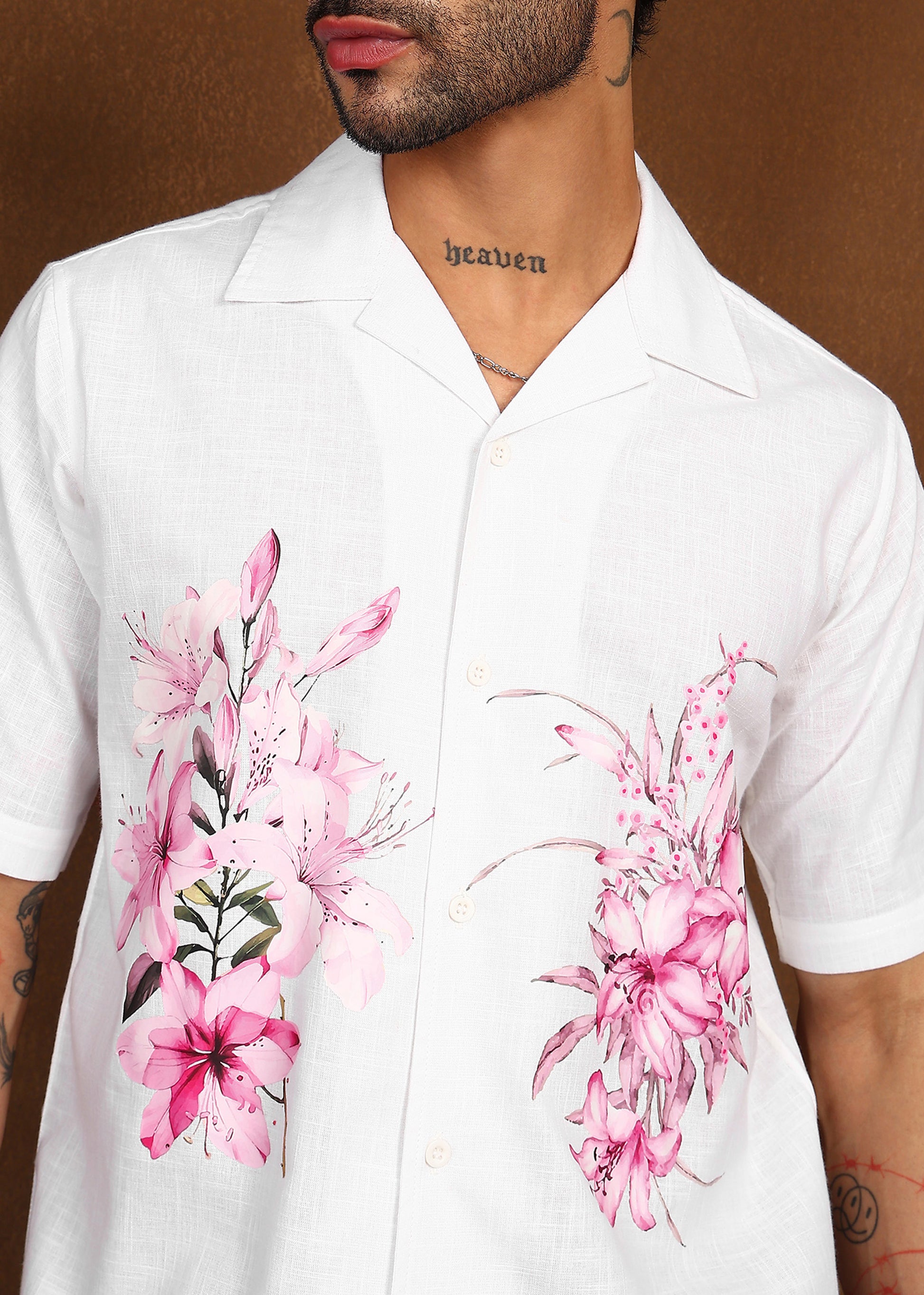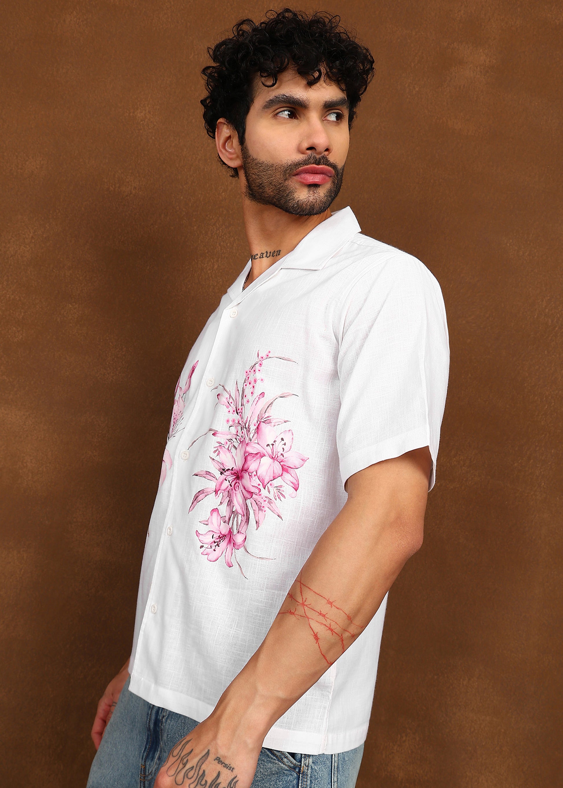 Soft, expressive, and effortlessly elegant, the Fabmade Blush Bloom Resort Shirt blends minimal tailoring with delicate floral artistry. Set on a crisp white base, the hand-placed pink floral print adds a refined statement while keeping the look balanced and wearable.
