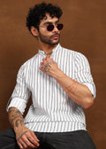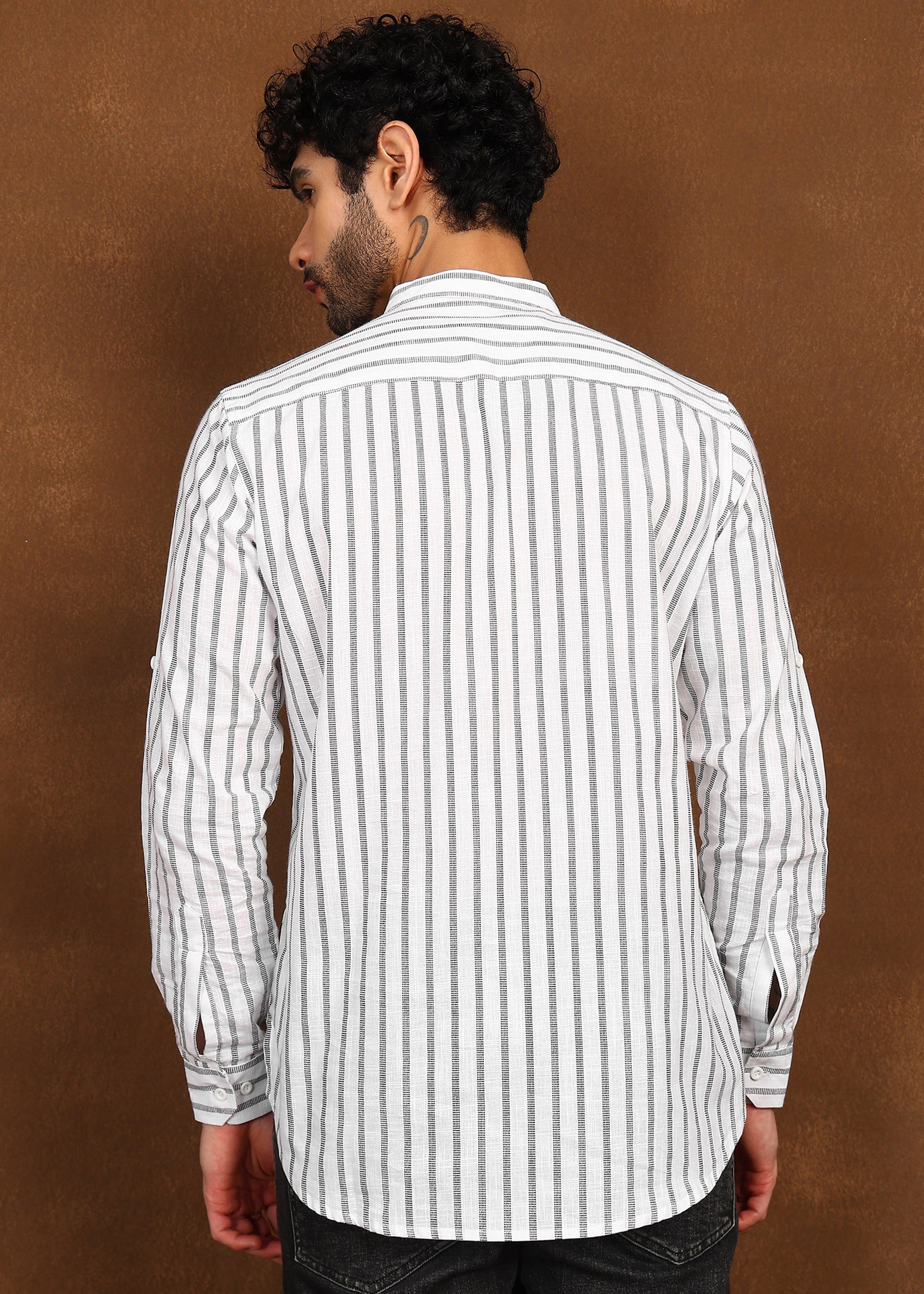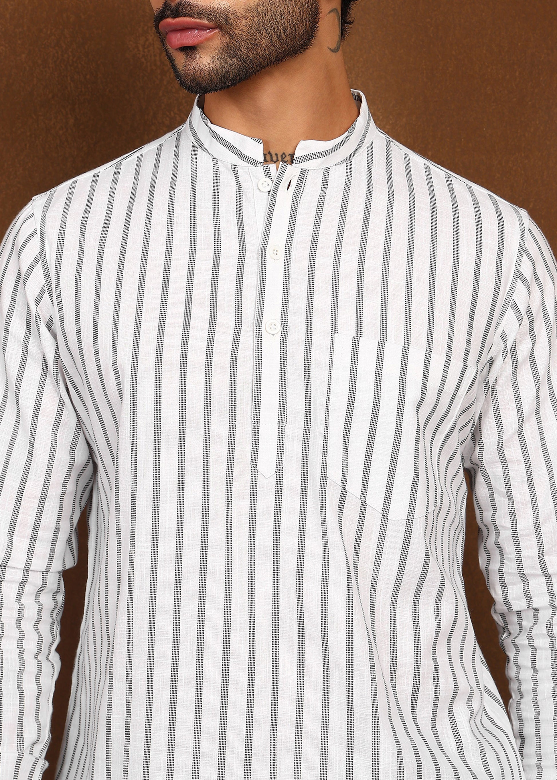 The vertical stripe pattern adds visual structure while maintaining a minimal aesthetic. Finished with a mandarin collar, a neat button placket, and a functional chest pocket, this kurta blends classic ethnic elements with a contemporary silhouette — perfect for everyday ethnic wear, casual gatherings, or polished Indo-western looks.