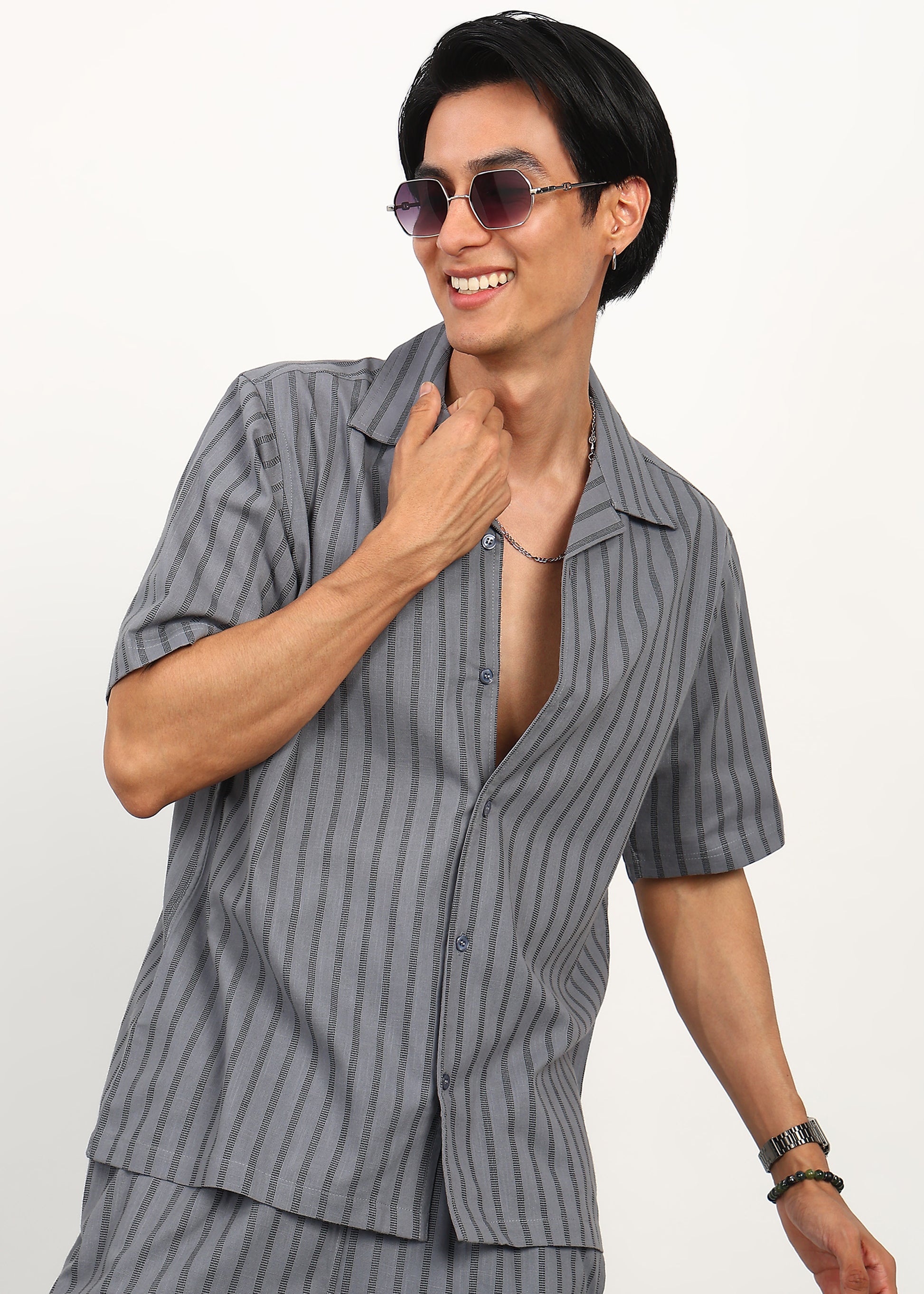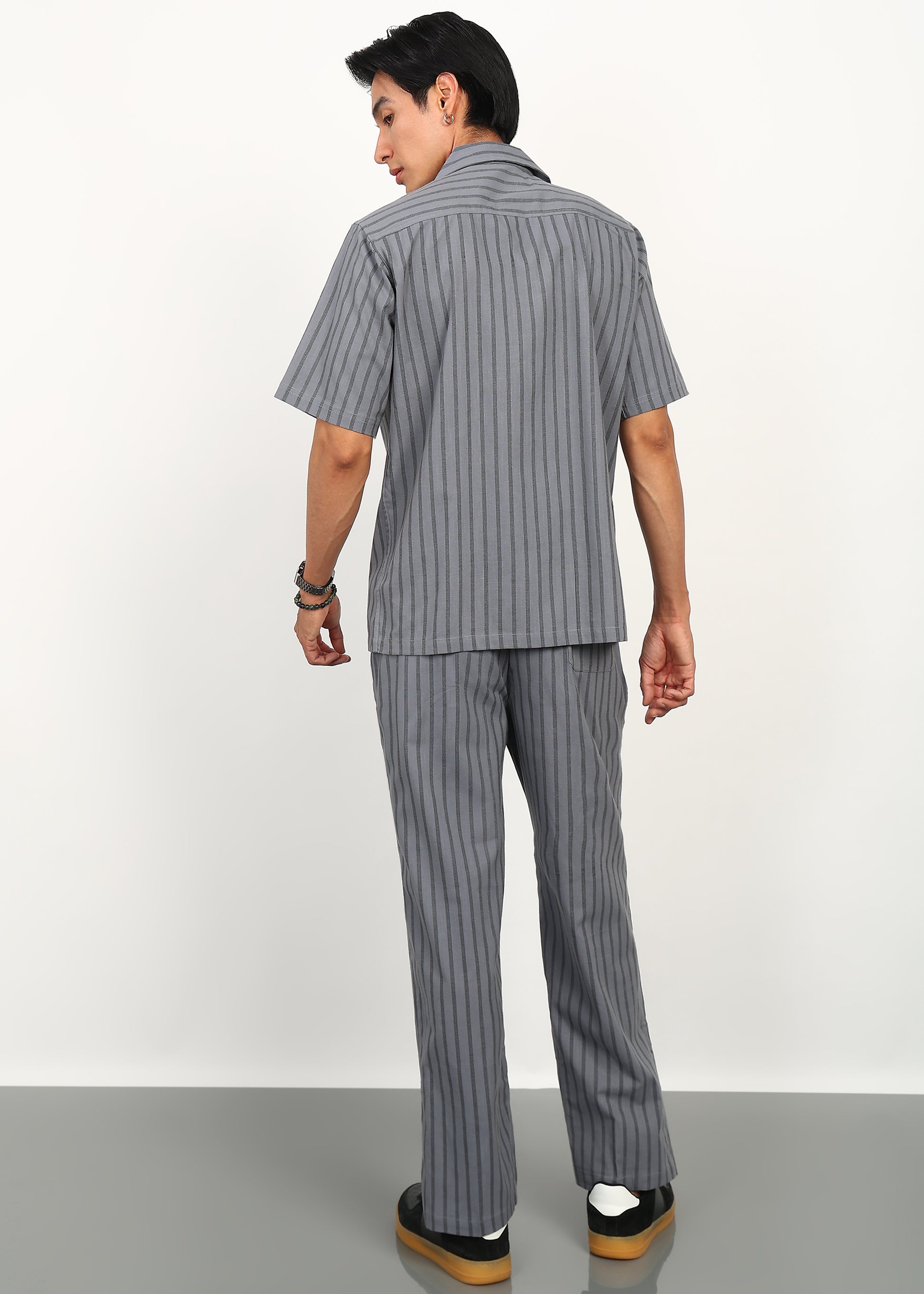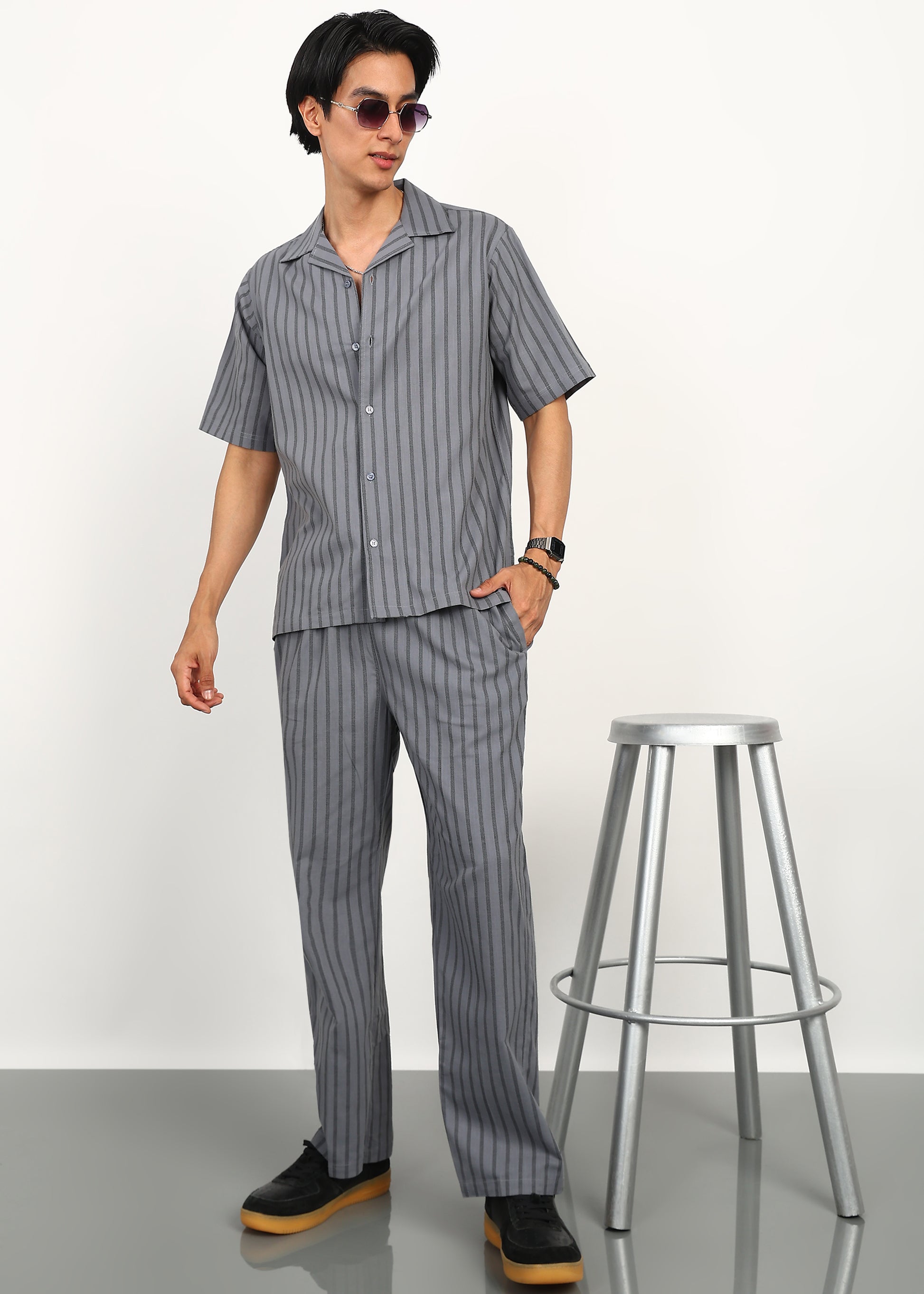 Minimal, modern, and effortlessly refined — the Fabmade Graphite Rhythm Co-Ord Set is crafted for those who appreciate subtle statement dressing. Featuring a deep graphite-grey base with refined vertical stripe detailing, this set strikes the perfect balance between structure and fluid movement.