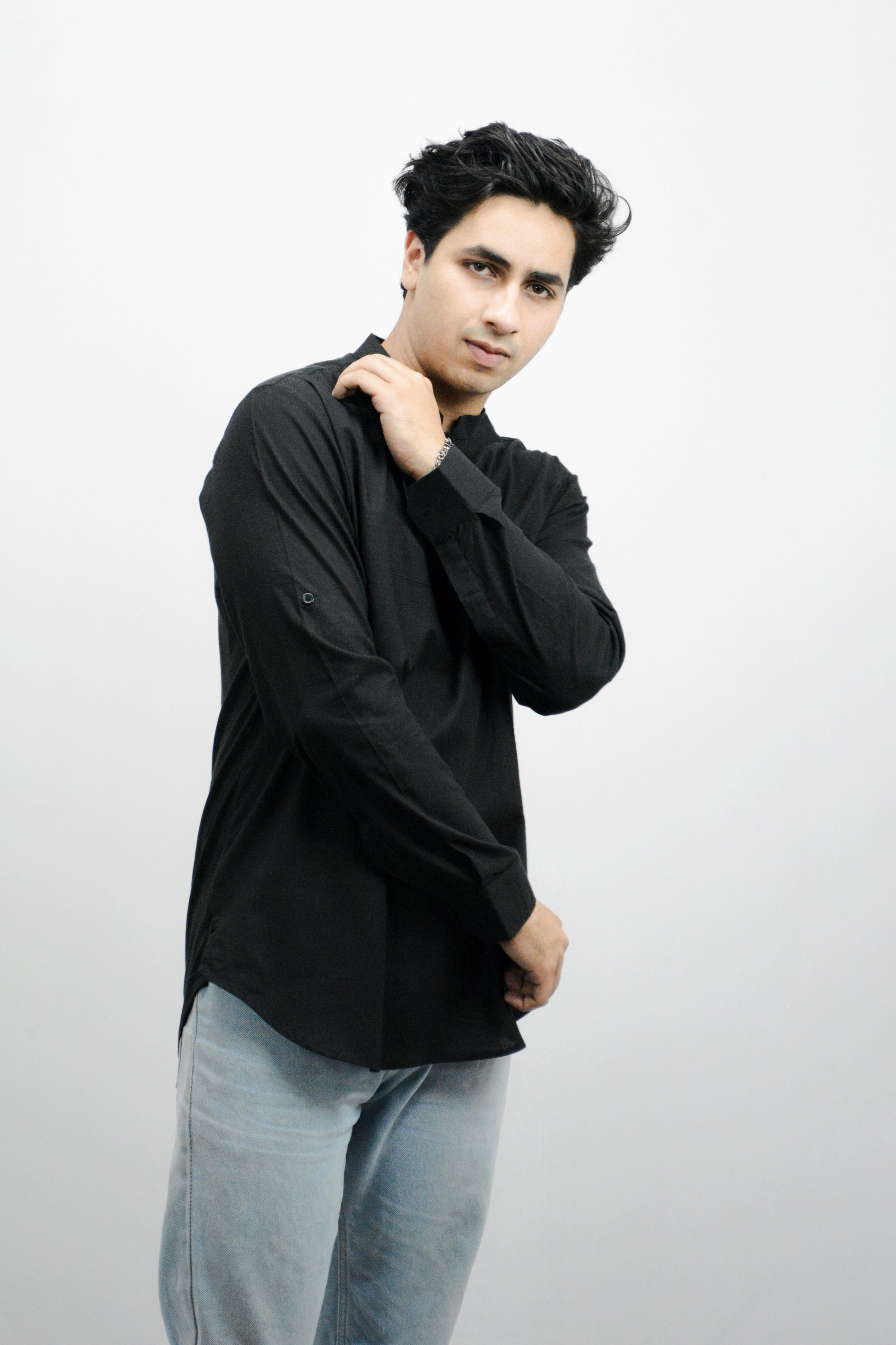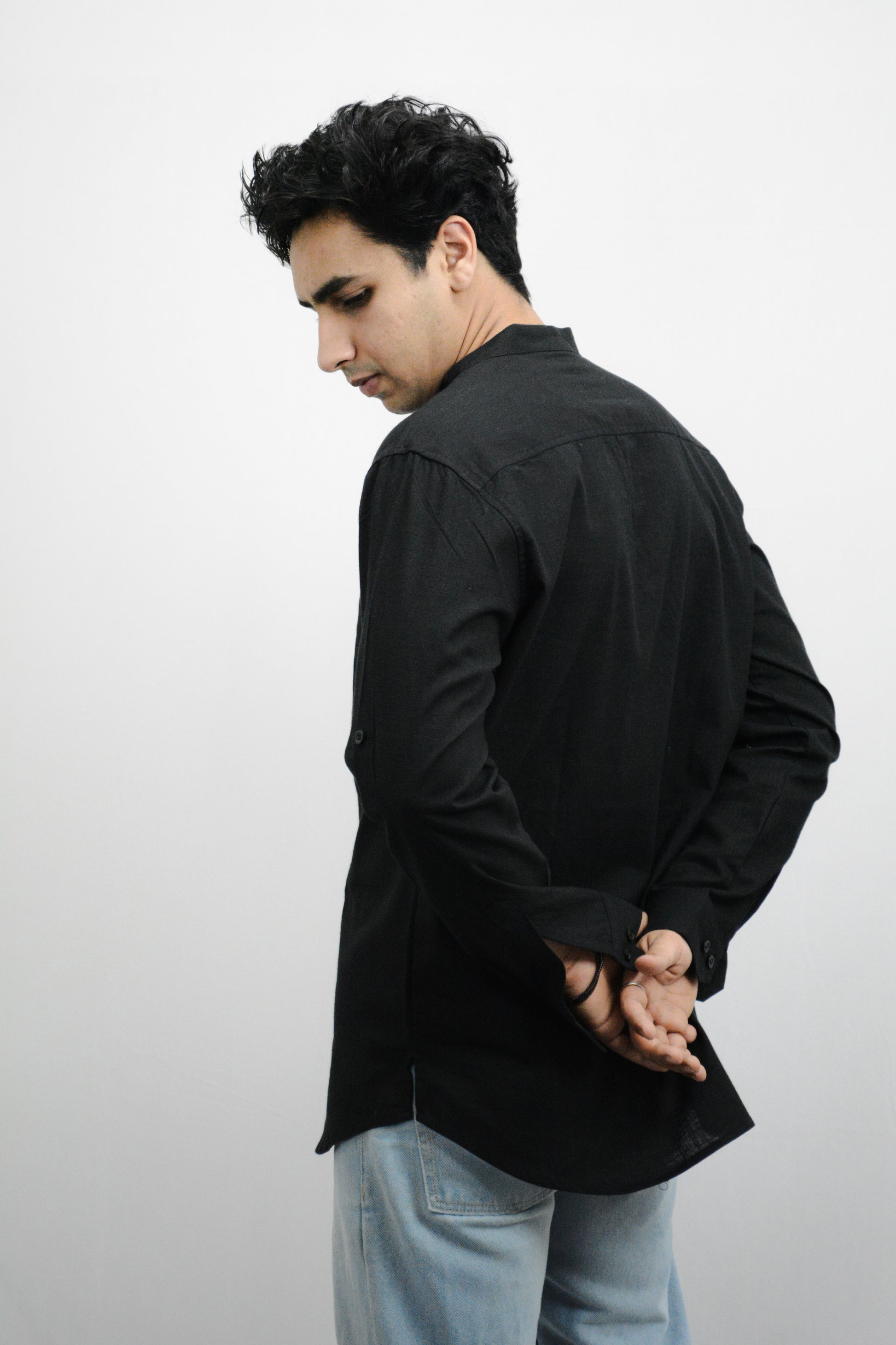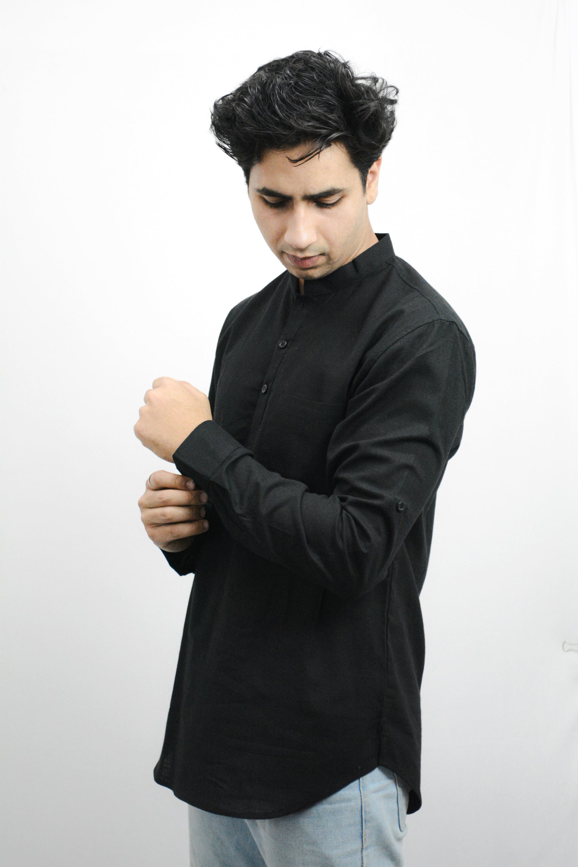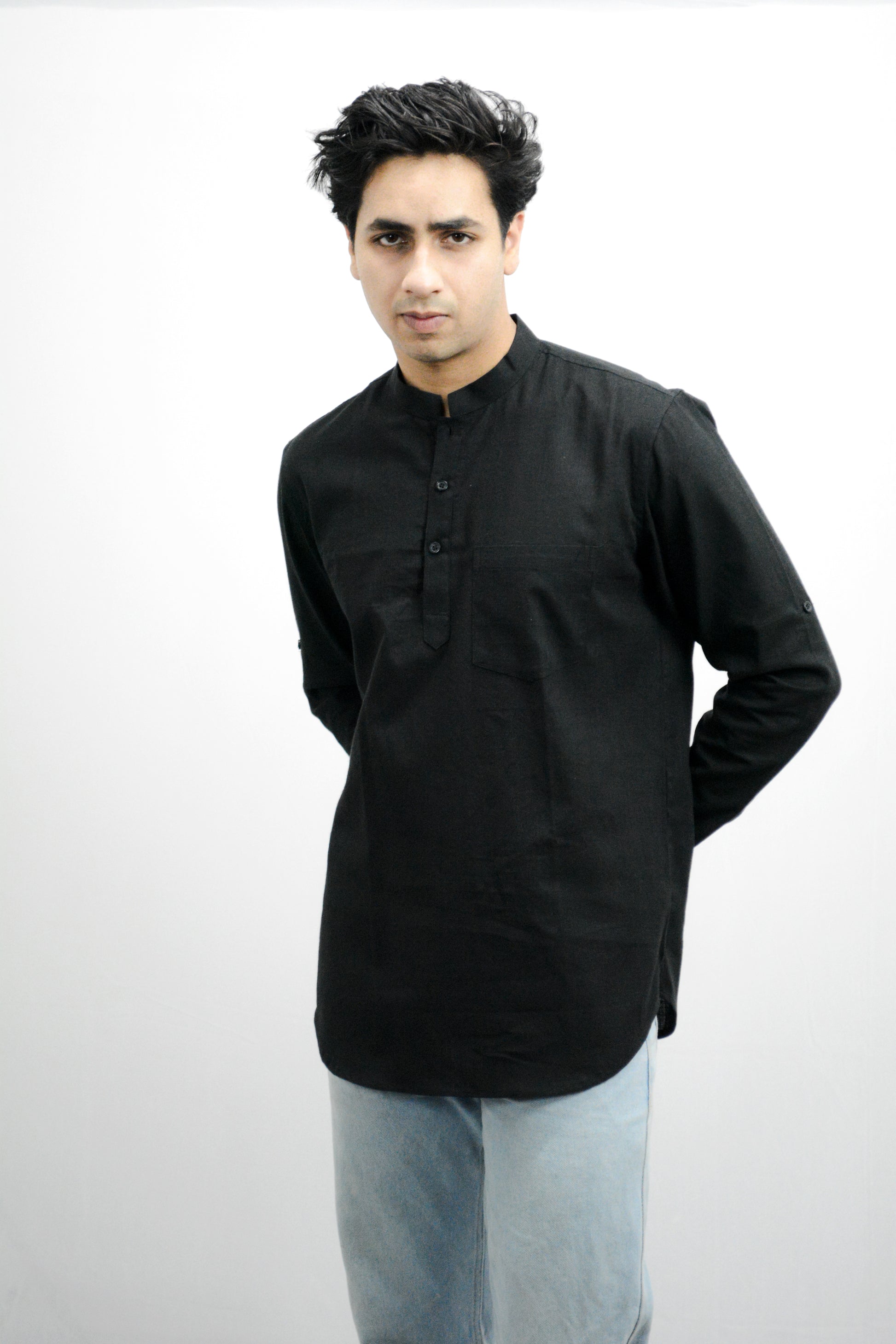 Fabmade - Men's Black Cotton-Linen Short Kurta