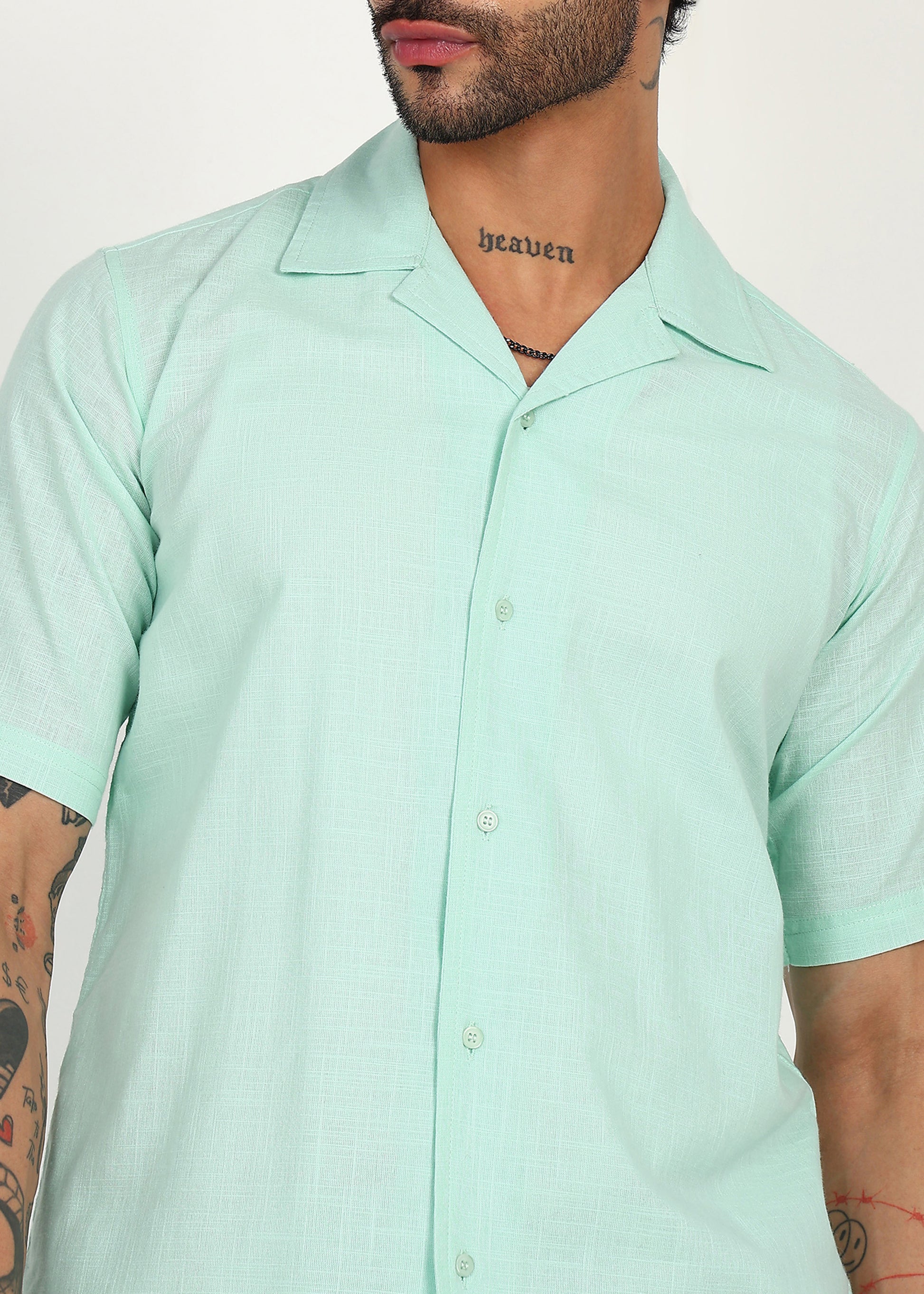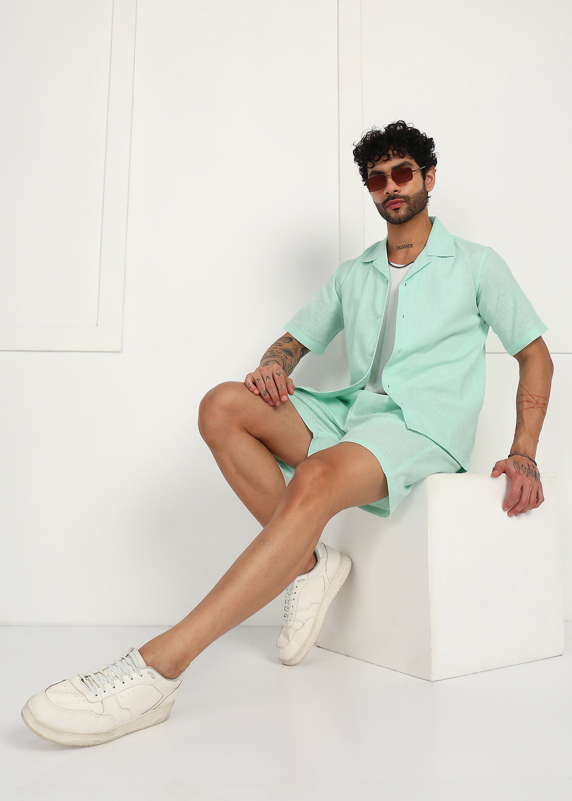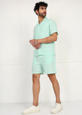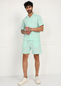 The short-sleeve shirt features a relaxed open collar and clean button-front design, while the matching shorts come with an elasticated waistband and adjustable drawstring for ease and flexibility. The soothing mint tone adds a cool, contemporary vibe, making it ideal for vacations, casual outings, and laid-back summer days.
