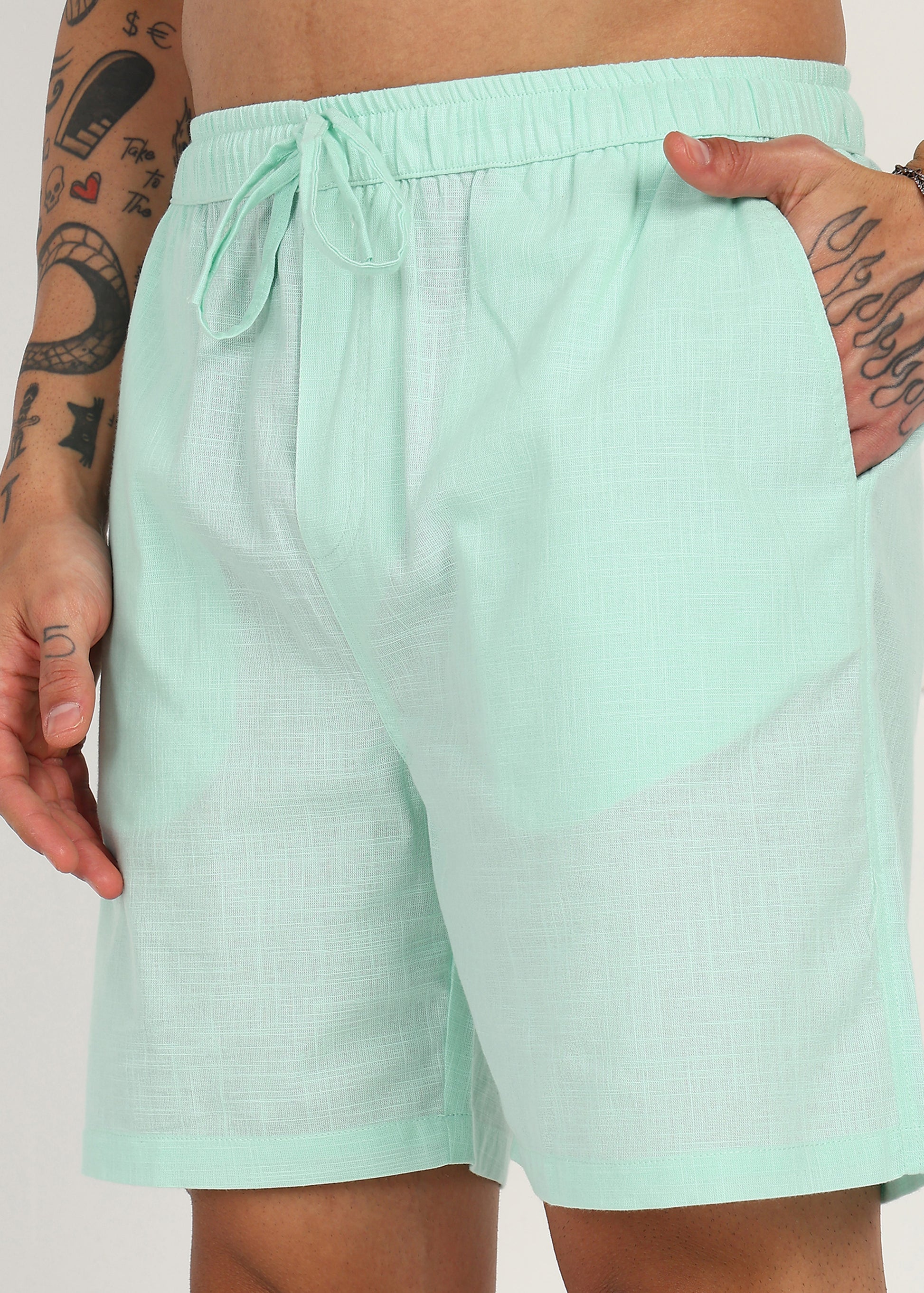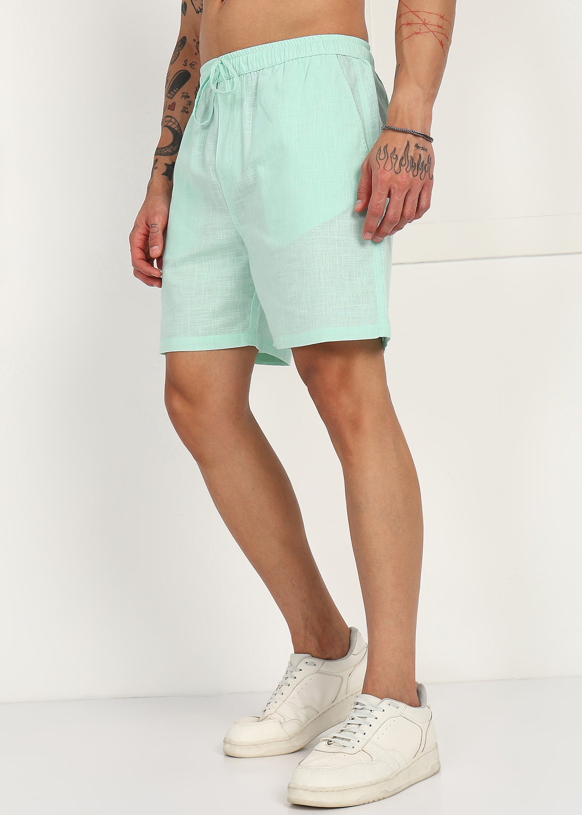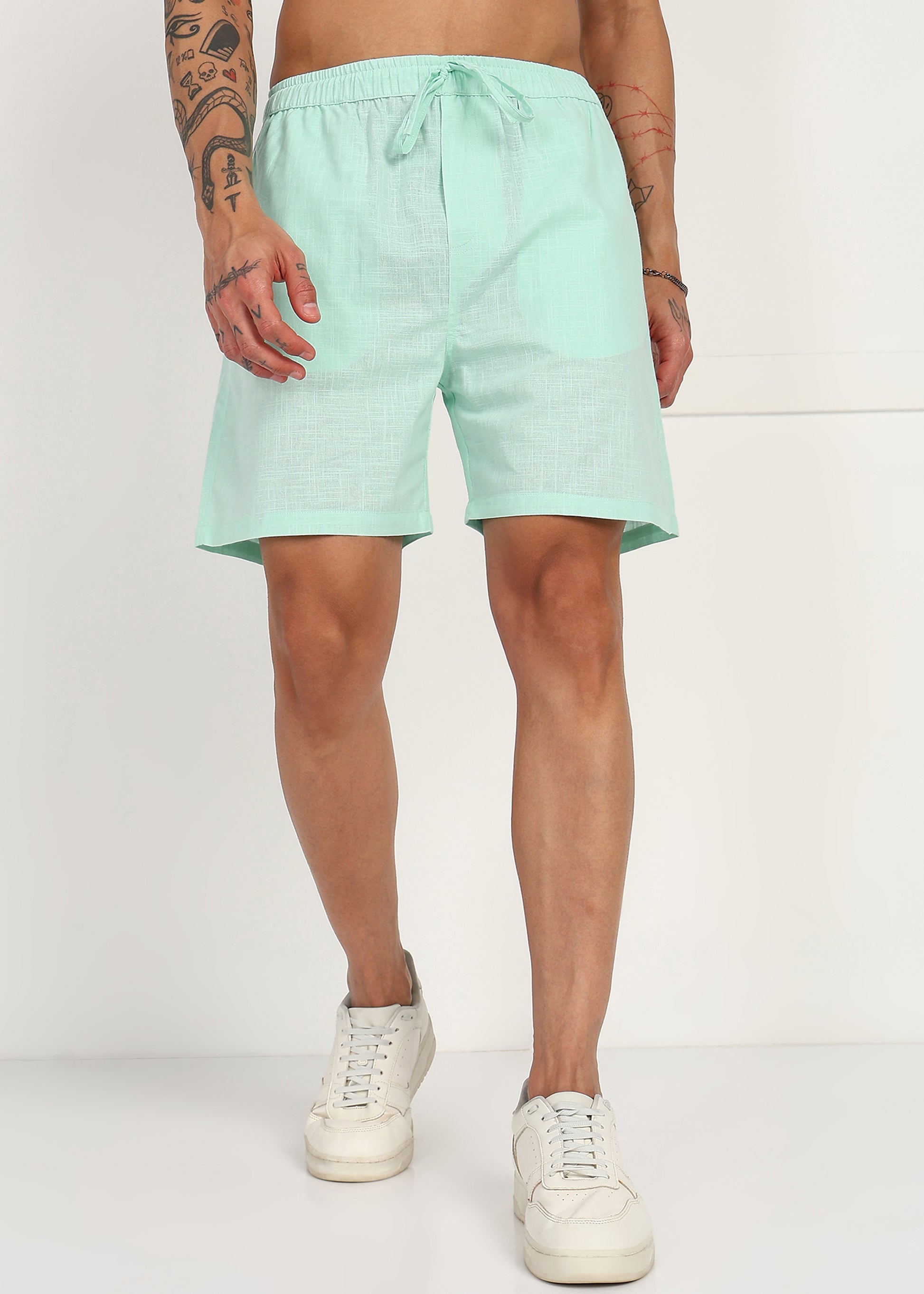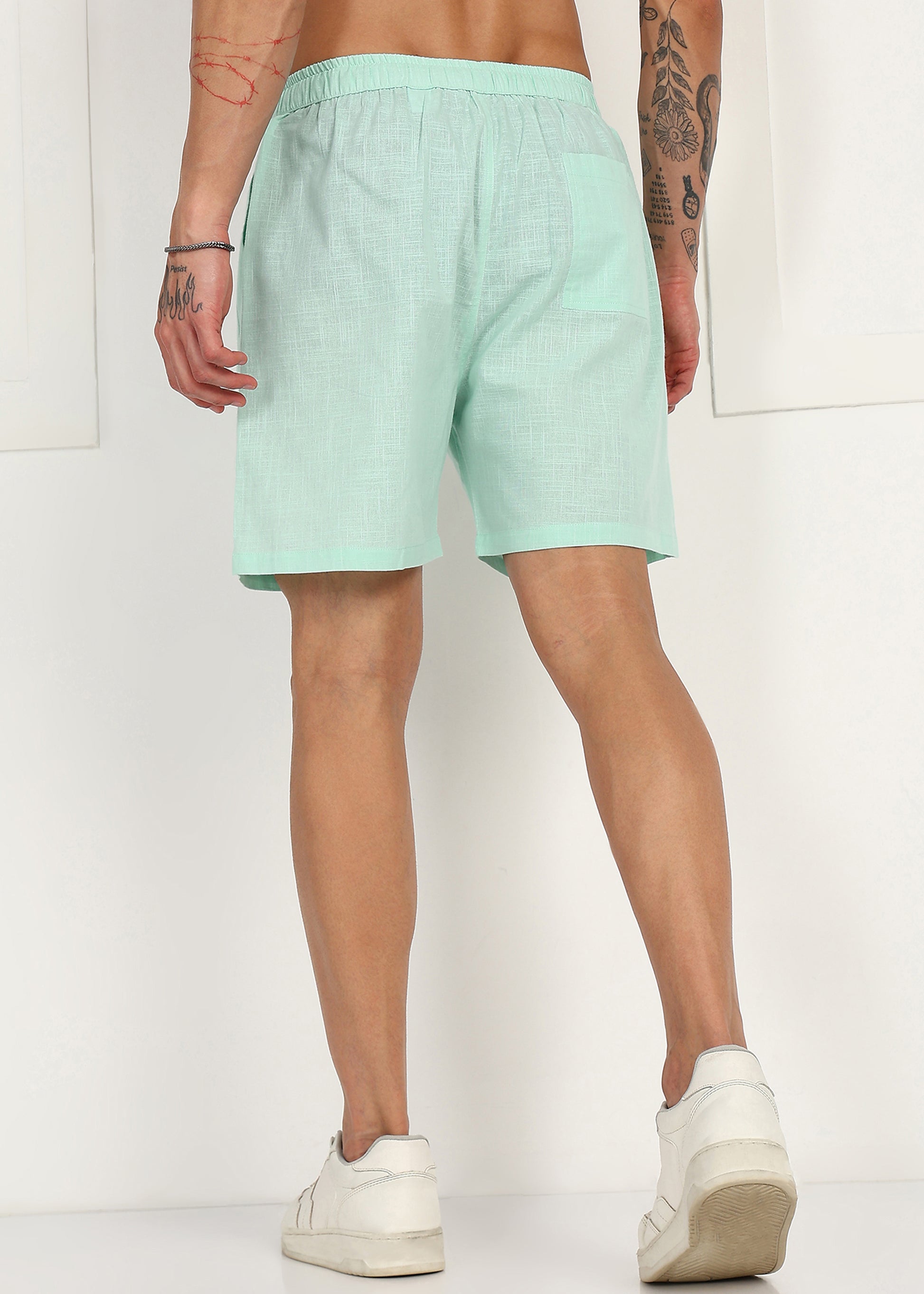 Designed with a comfortable elasticated waistband and adjustable drawstring, these shorts offer a flexible fit without compromising on style. The fresh mint tone adds a modern, laid-back vibe, making them ideal for casual outings, vacations, and everyday wear.