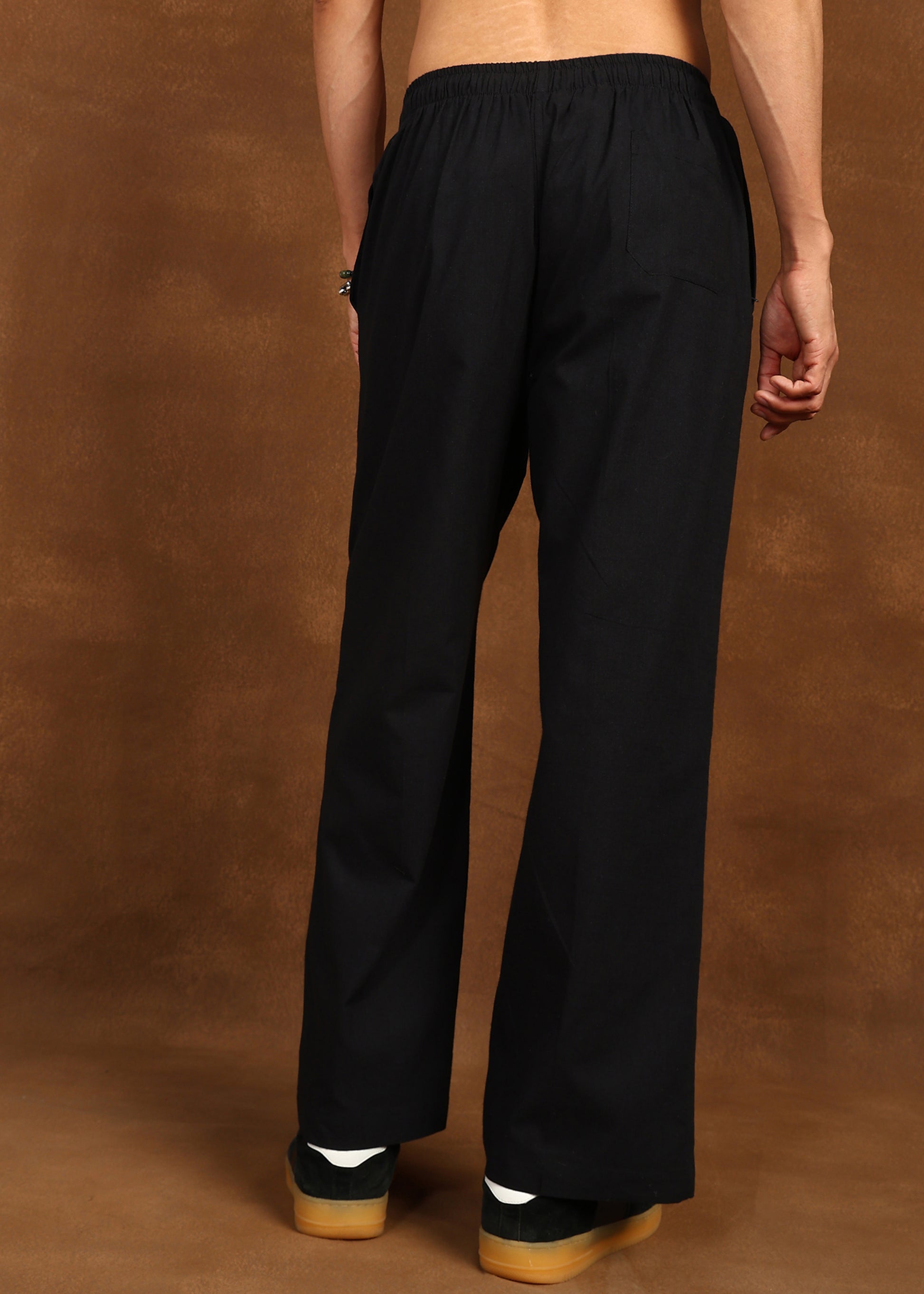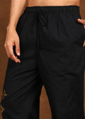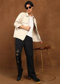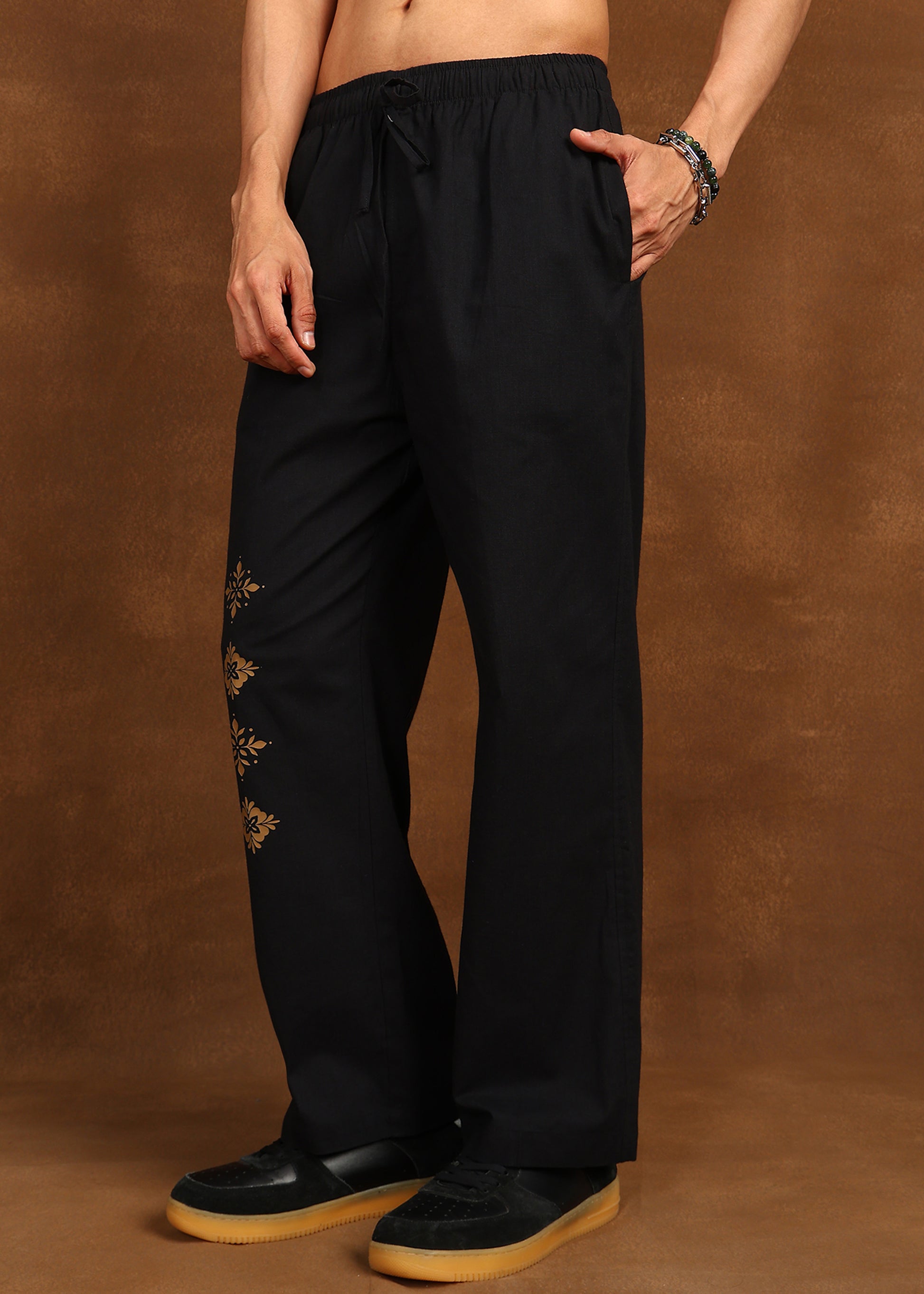 Designed to complement understated luxury, the Fabmade Noir Bloom Trousers bring refined detail to a timeless silhouette. Crafted in a deep jet-black tone, these trousers feature subtle gold floral motifs placed along the leg—adding an elegant accent while keeping the overall look clean and modern.