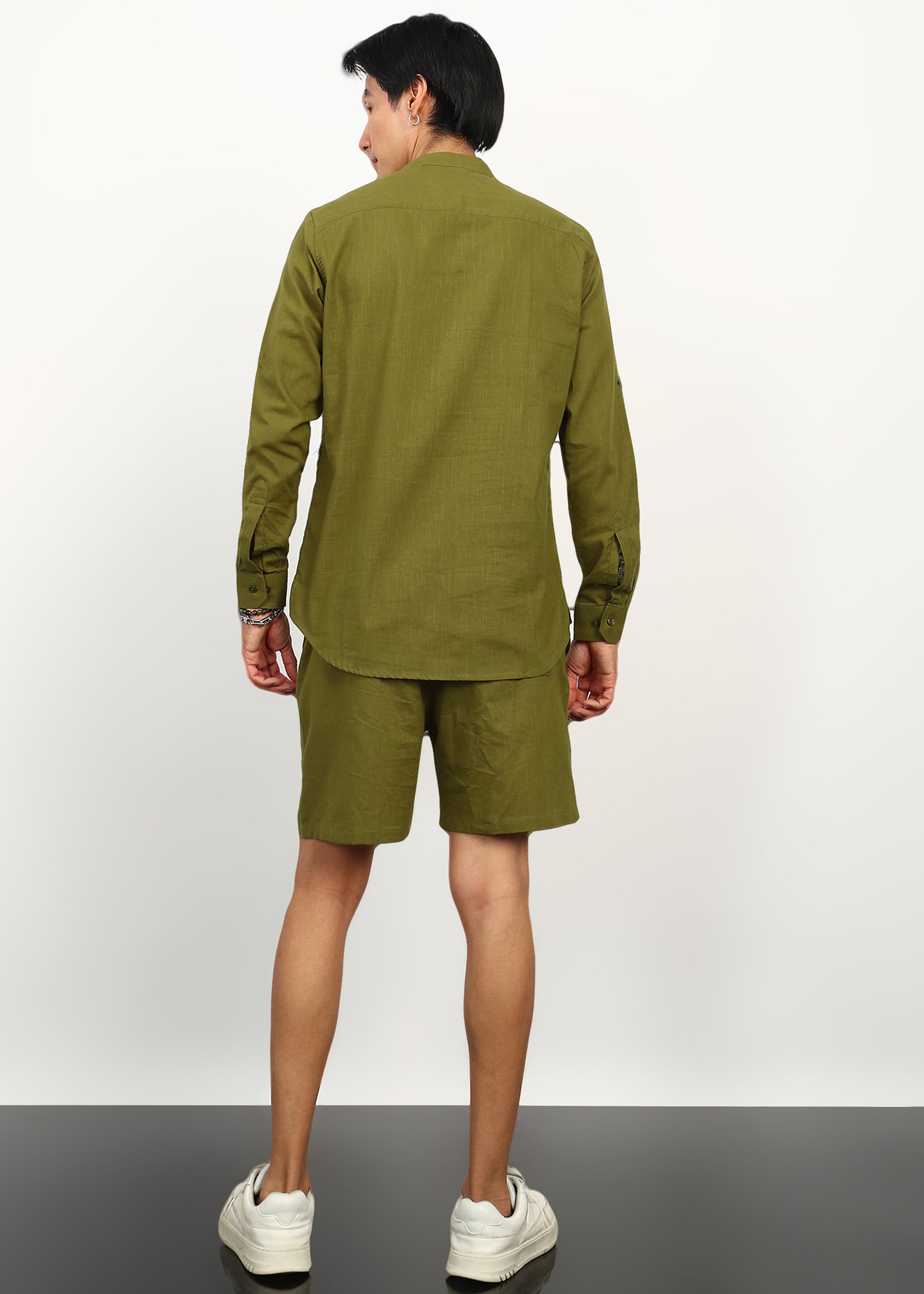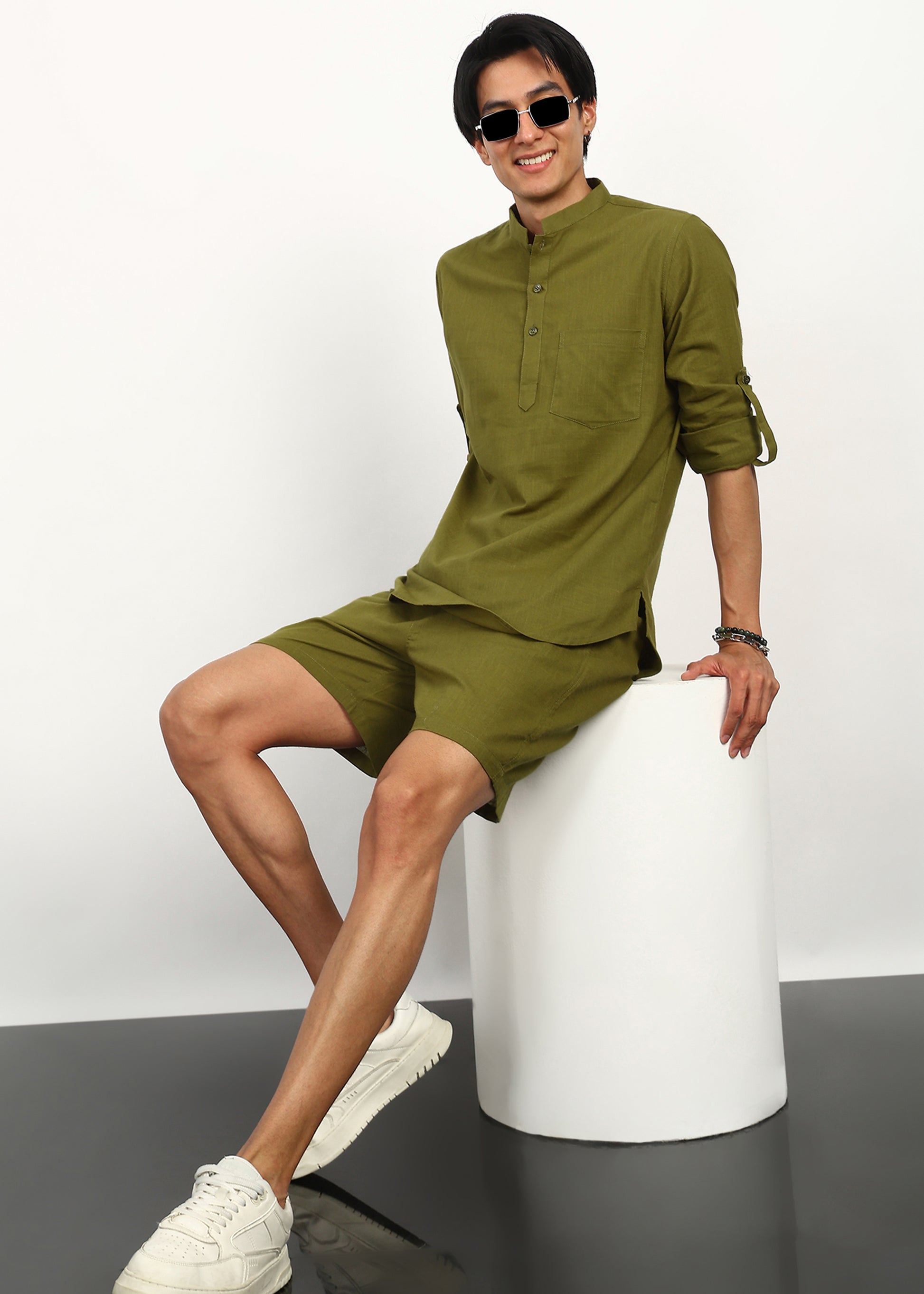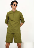 Fresh, minimal, and effortlessly modern — the Fabmade Olive Breeze Co-Ord Set is designed for relaxed days and elevated casual styling. Crafted from breathable linen fabric, this set features a structured olive kurta paired with matching relaxed-fit shorts, creating a balanced silhouette that feels light yet refined.