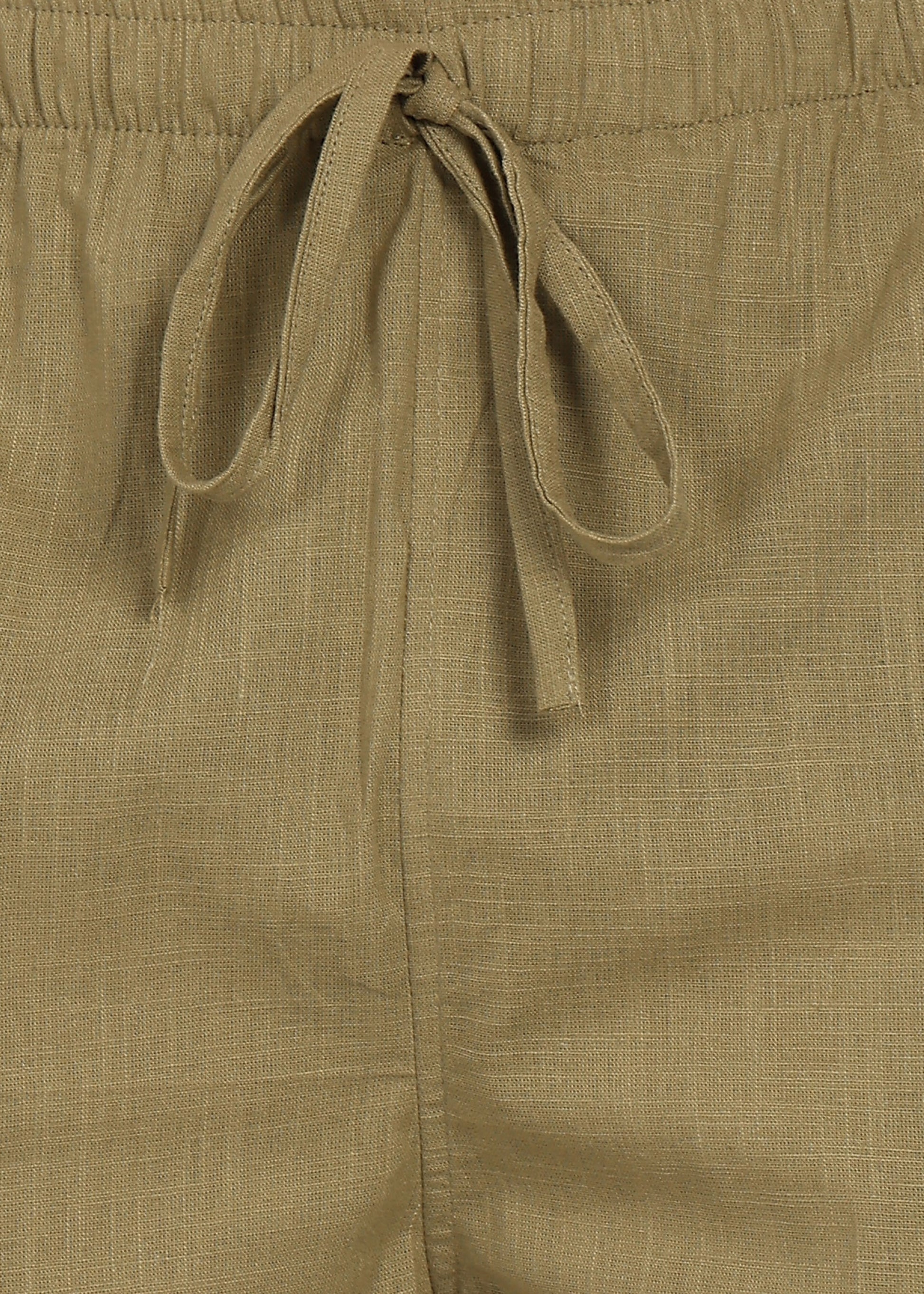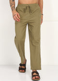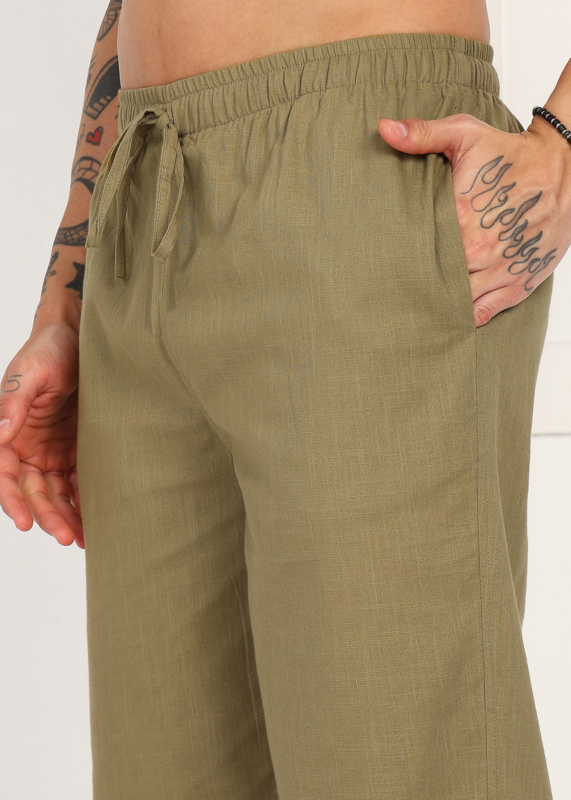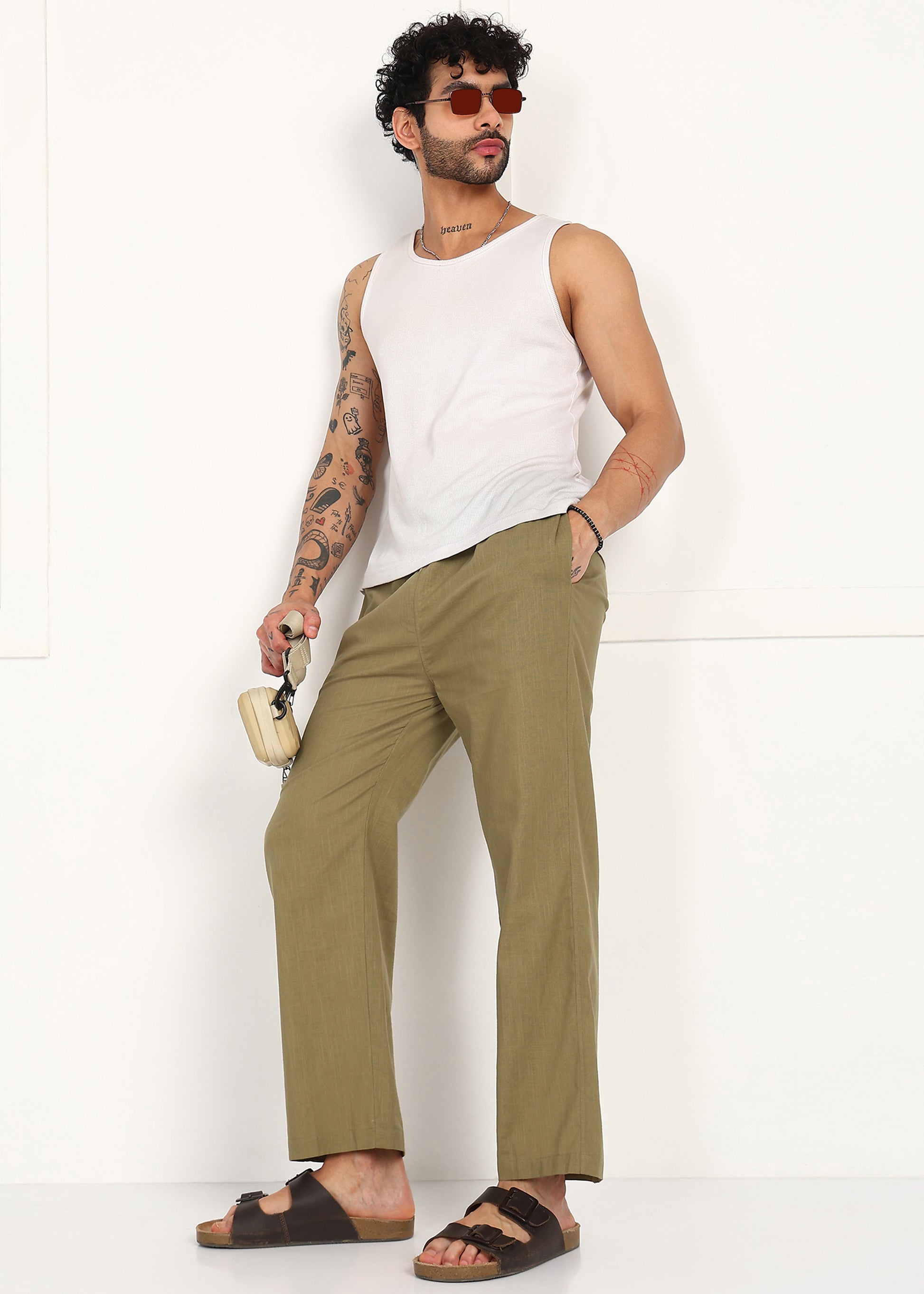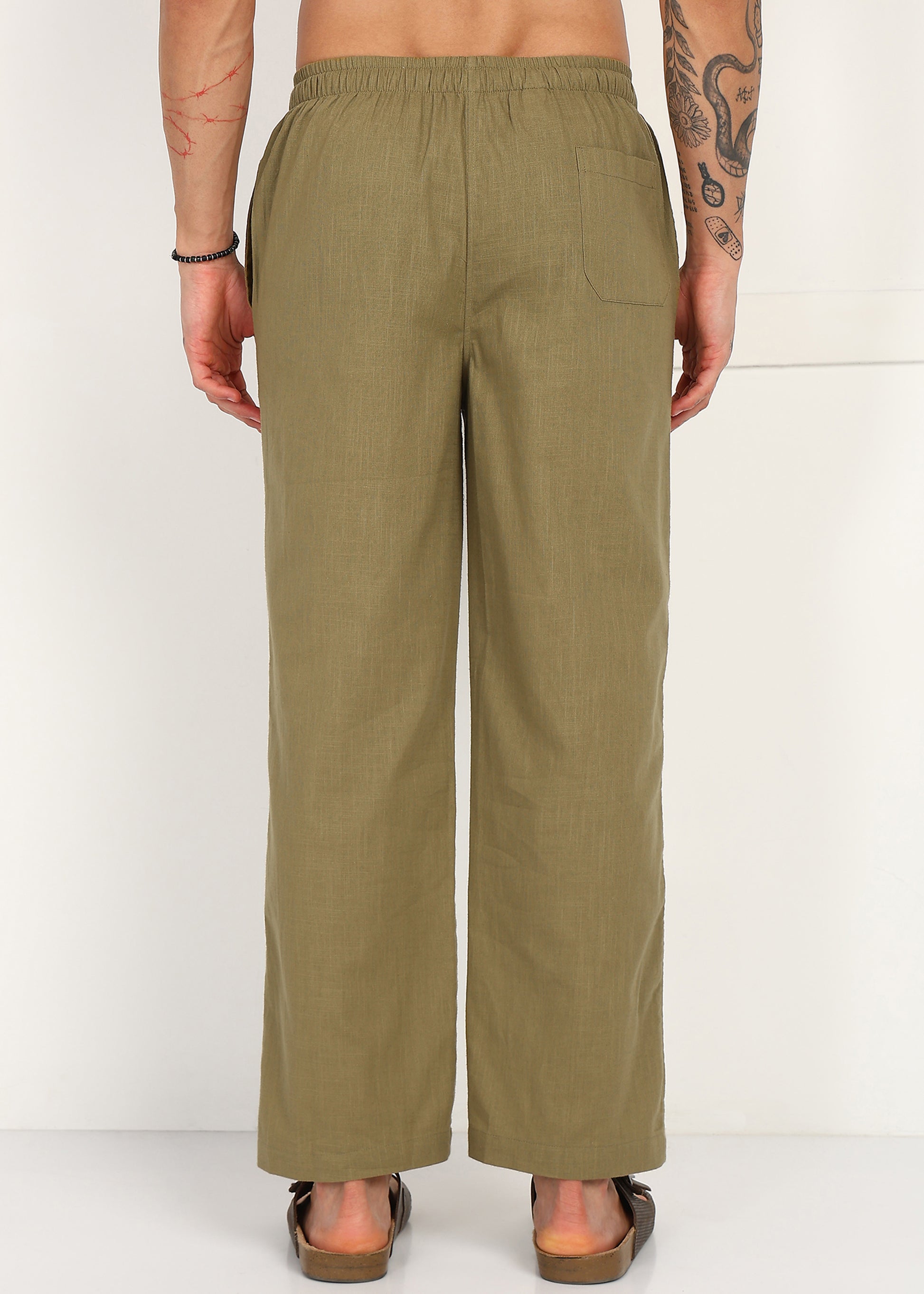 Designed with a clean straight-fit silhouette and an easy elasticated waistband, it offers unrestricted movement while maintaining a refined, minimal look. The earthy olive tone adds a natural sophistication, making it ideal for pairing with kurtas, shirts, or linen coord tops for both ethnic and Indo-casual styling.