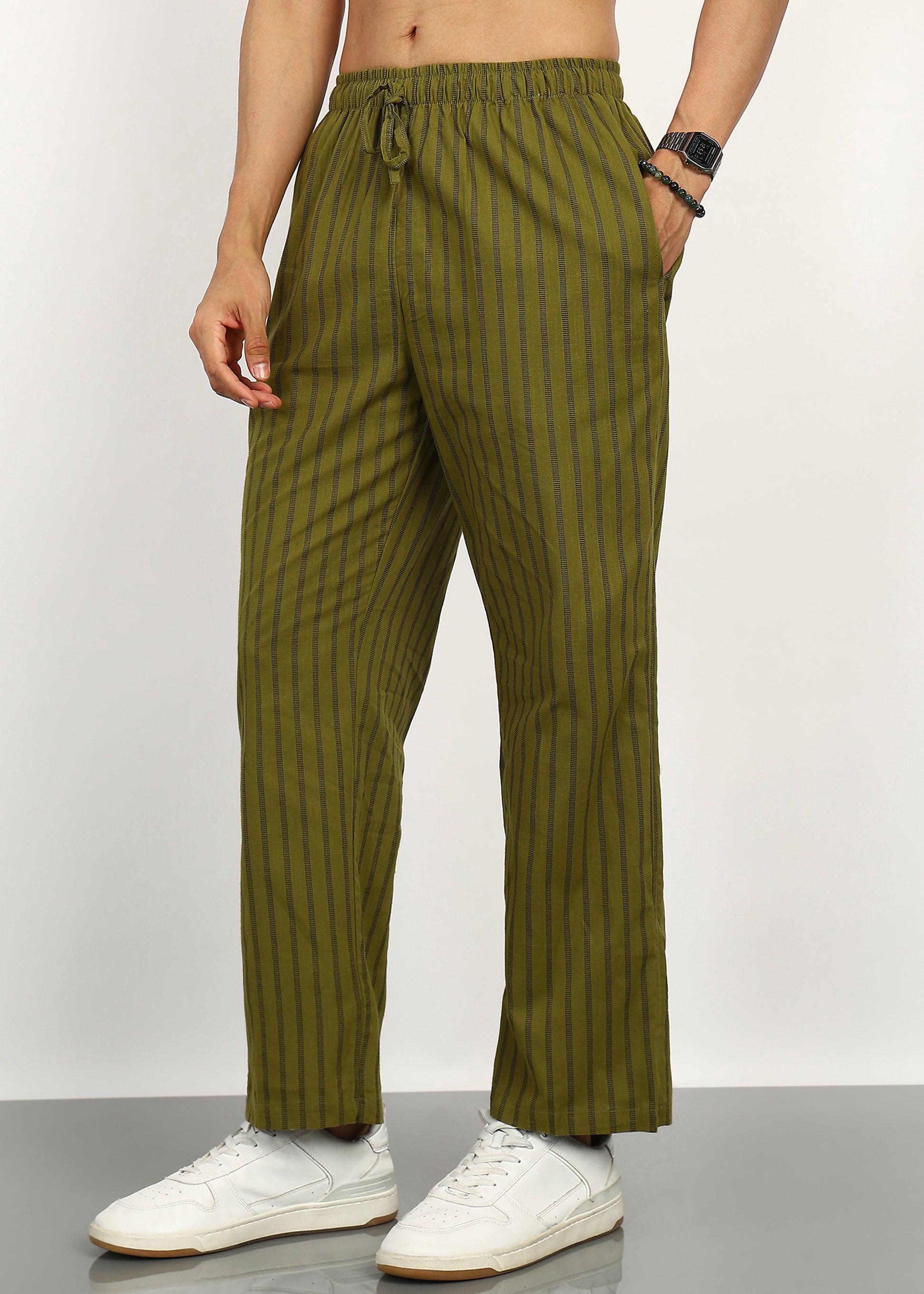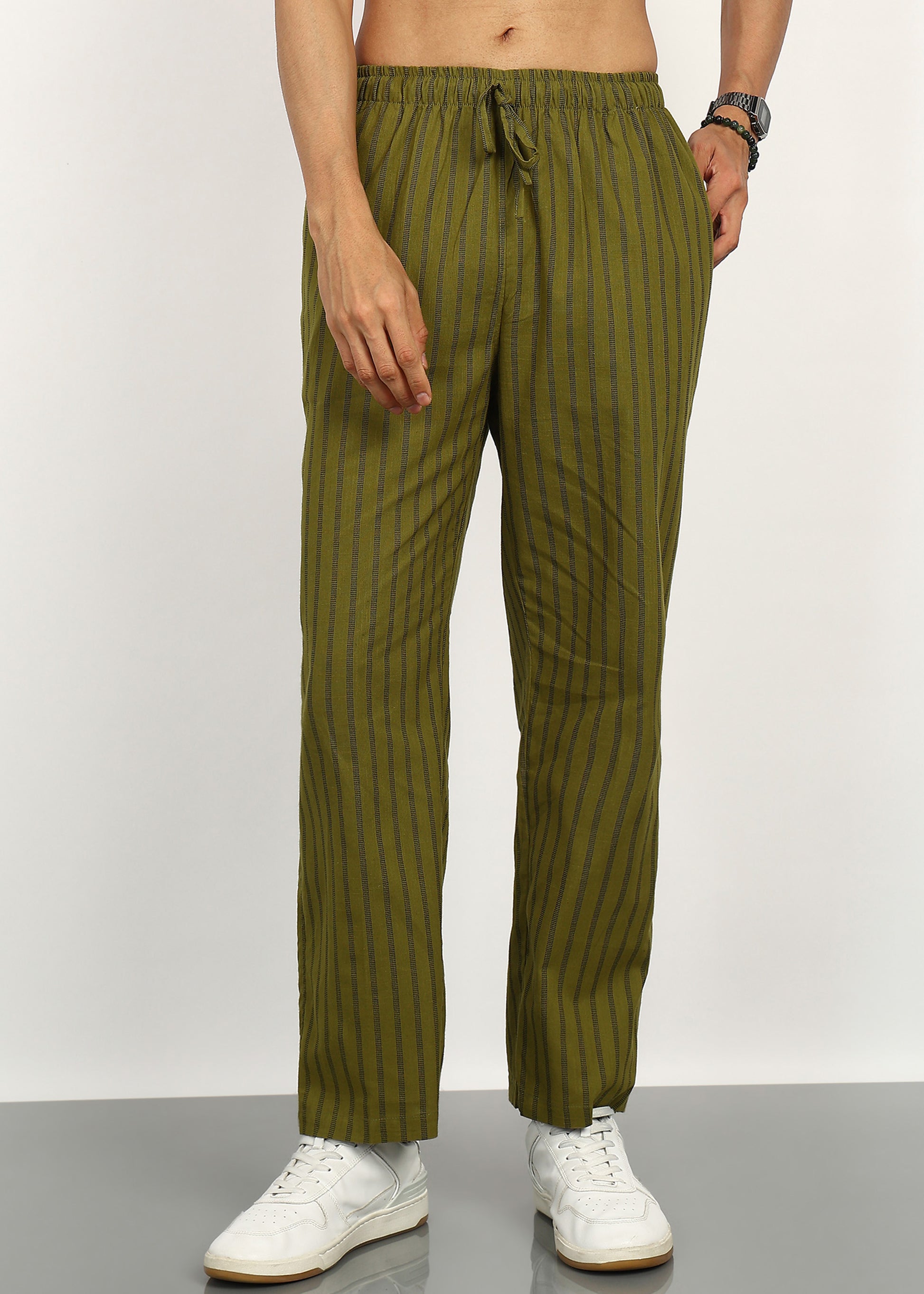 The earthy olive tone paired with classic stripes makes them versatile for ethnic wear, fusion outfits, and everyday casual styling. Lightweight and airy, they’re perfect for warm weather and all-day wear.