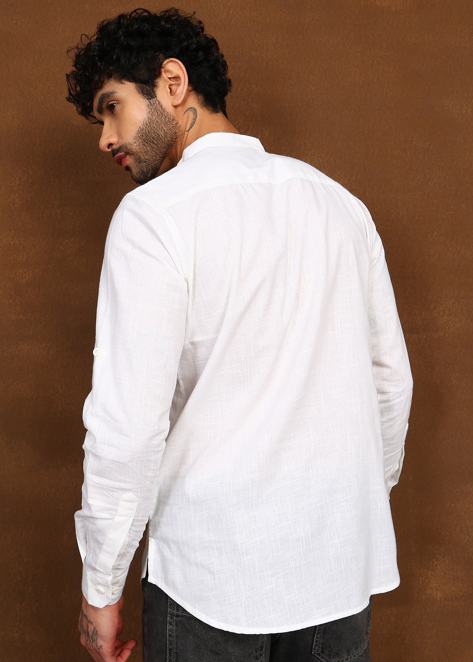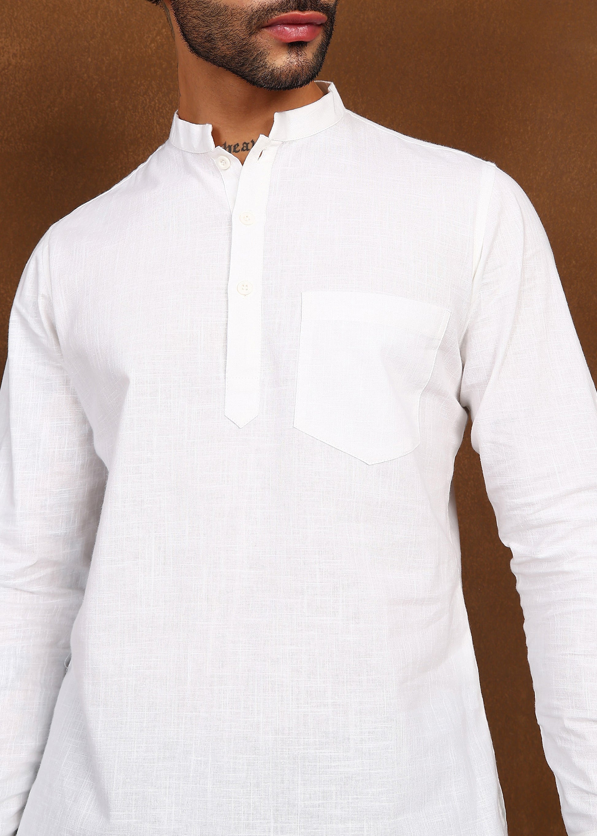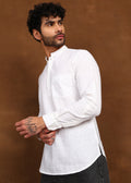 Featuring a structured mandarin collar, a minimal button placket, and a sharp chest pocket, this piece blends traditional simplicity with a modern silhouette. The crisp ivory white tone enhances its versatility, making it ideal for casual ethnic wear, festive occasions, or polished everyday styling.