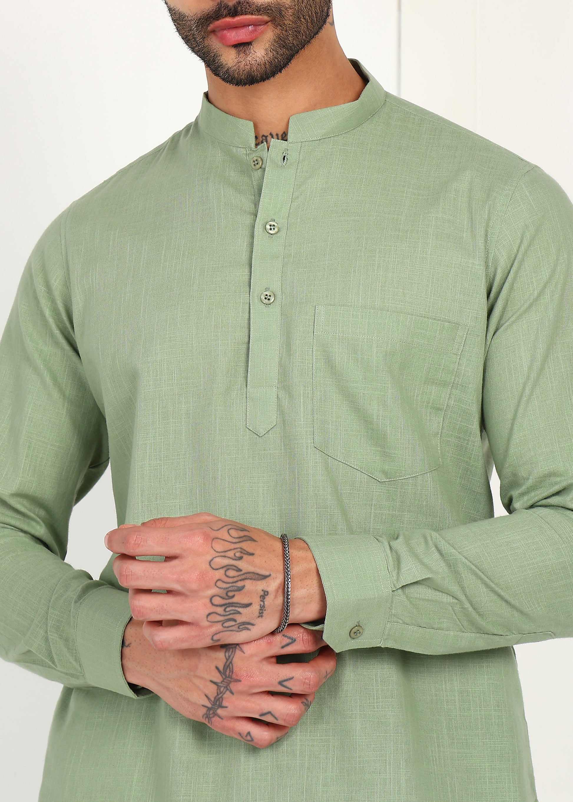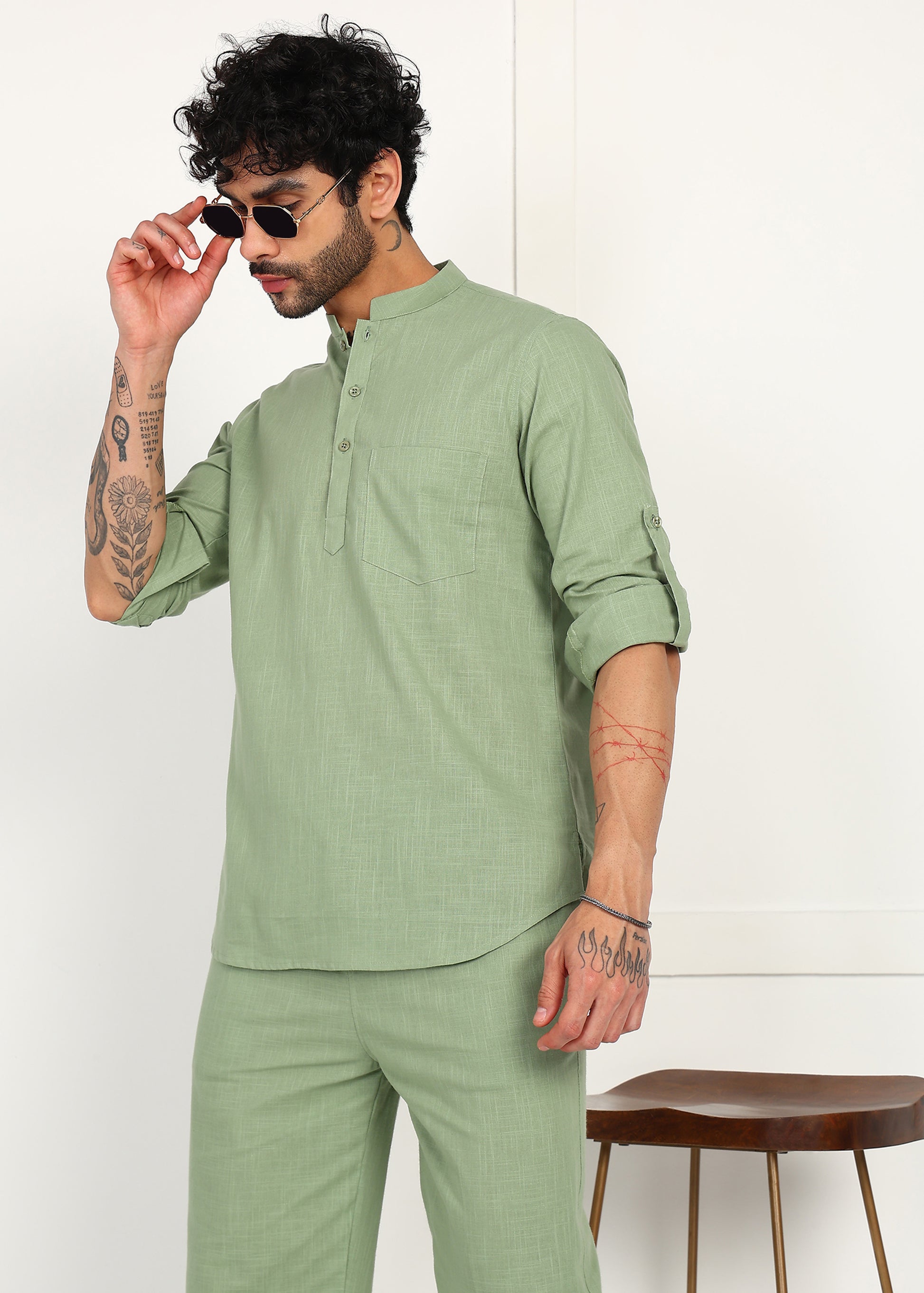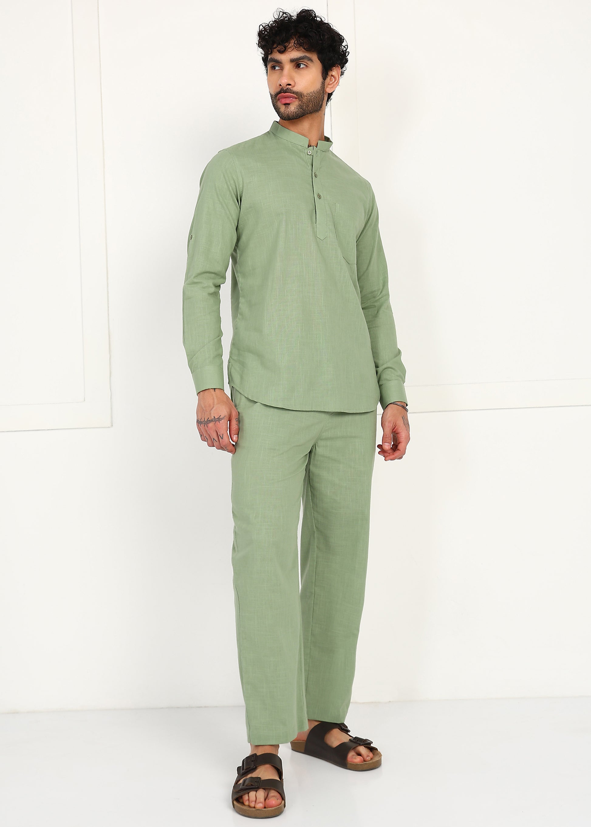 Effortlessly refined and rooted in comfort, the Fabmade Sage Linen Kurta Co-Ord Set is crafted for modern men who appreciate minimal elegance. Featuring a mandarin-collar kurta paired with relaxed straight-fit pants, this set delivers a balanced blend of tradition and contemporary style.