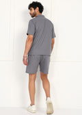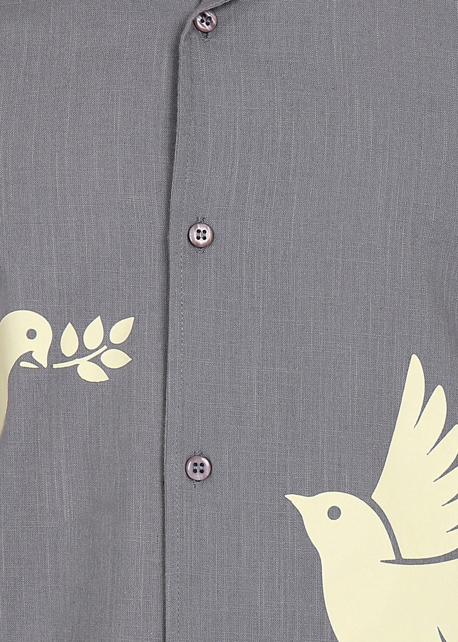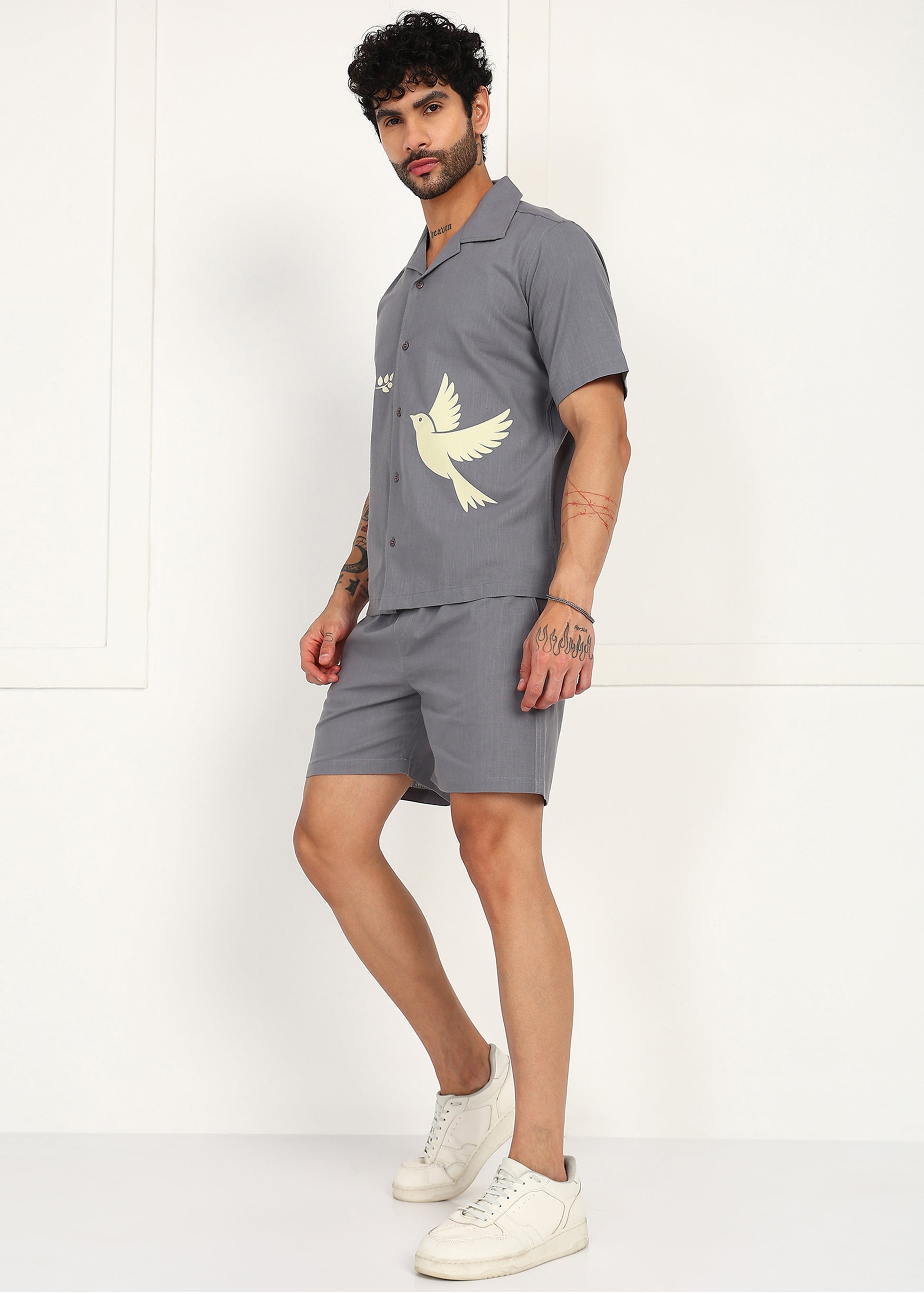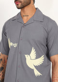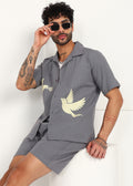 The short-sleeve button-down shirt features a calm slate-grey base, elevated with subtle dove motif artwork that adds character without overpowering the look. Paired with matching straight-fit shorts, the set delivers a balanced silhouette that feels refined, relaxed, and versatile.