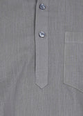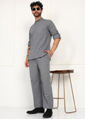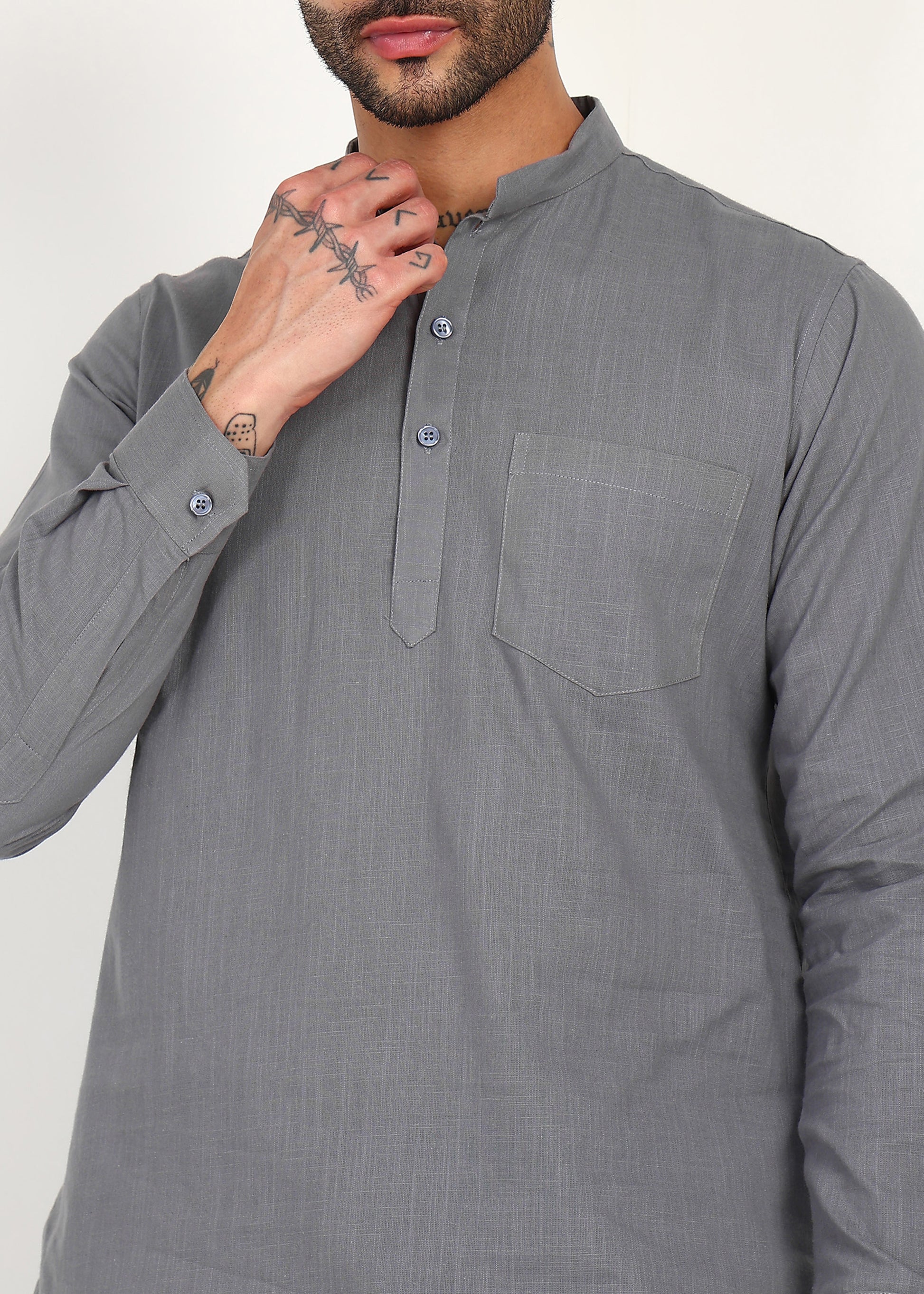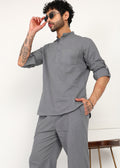 The short kurta features a structured mandarin collar, minimal button placket, and a clean chest pocket, while the matching linen pyjama offers a relaxed straight fit with an elasticated waistband for ease and comfort. The sophisticated slate grey tone adds versatility, making this co-ord set ideal for casual ethnic wear, festive occasions, or polished everyday looks.