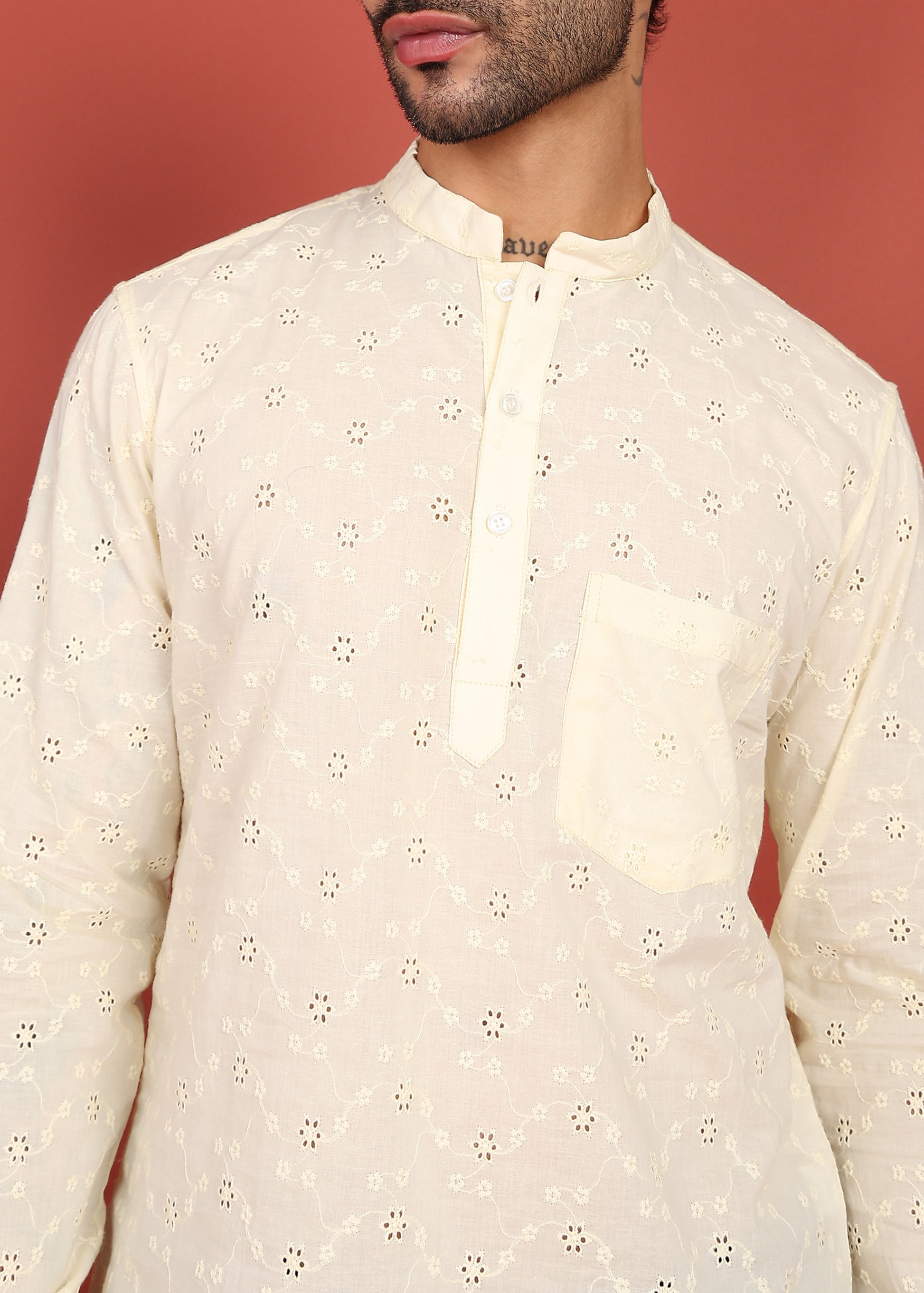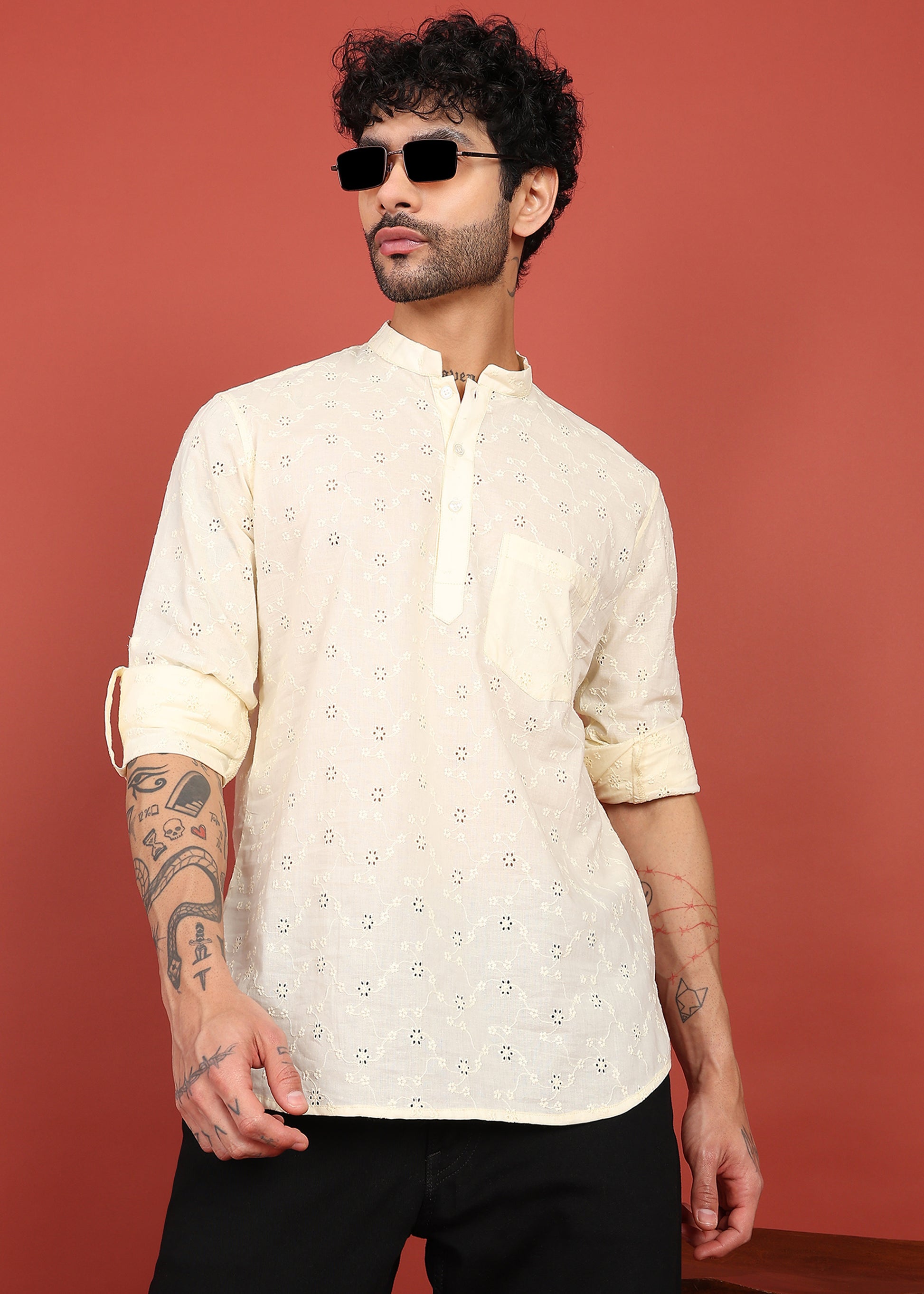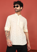 The Ivory Noor Dotted Short Kurta blends timeless elegance with modern craftsmanship. Designed in a soft, breathable fabric, this kurta features intricate all-over embroidery that adds subtle texture and sophistication. The mandarin collar with a clean button placket enhances its Indo-western appeal, while the relaxed silhouette ensures all-day comfort. Ideal for festive occasions, summer celebrations, and refined casual wear, this piece pairs effortlessly with pyjamas, trousers, or denim.