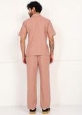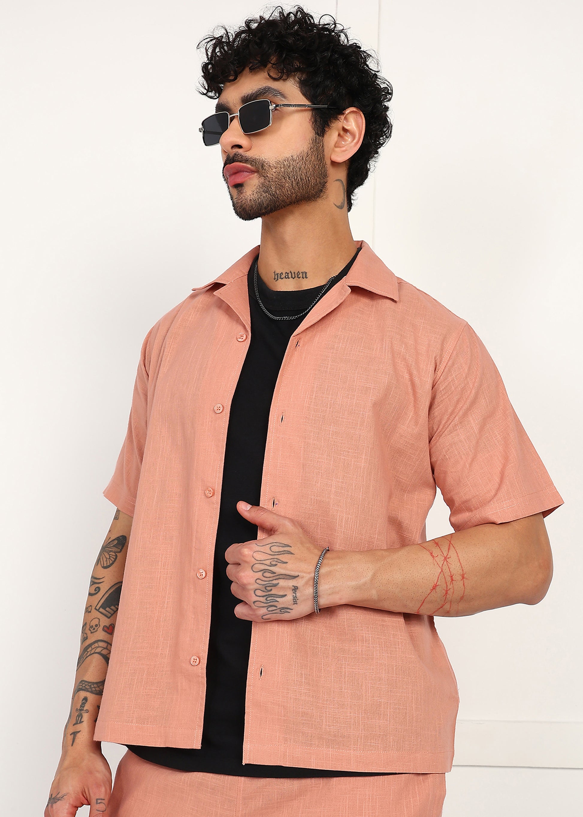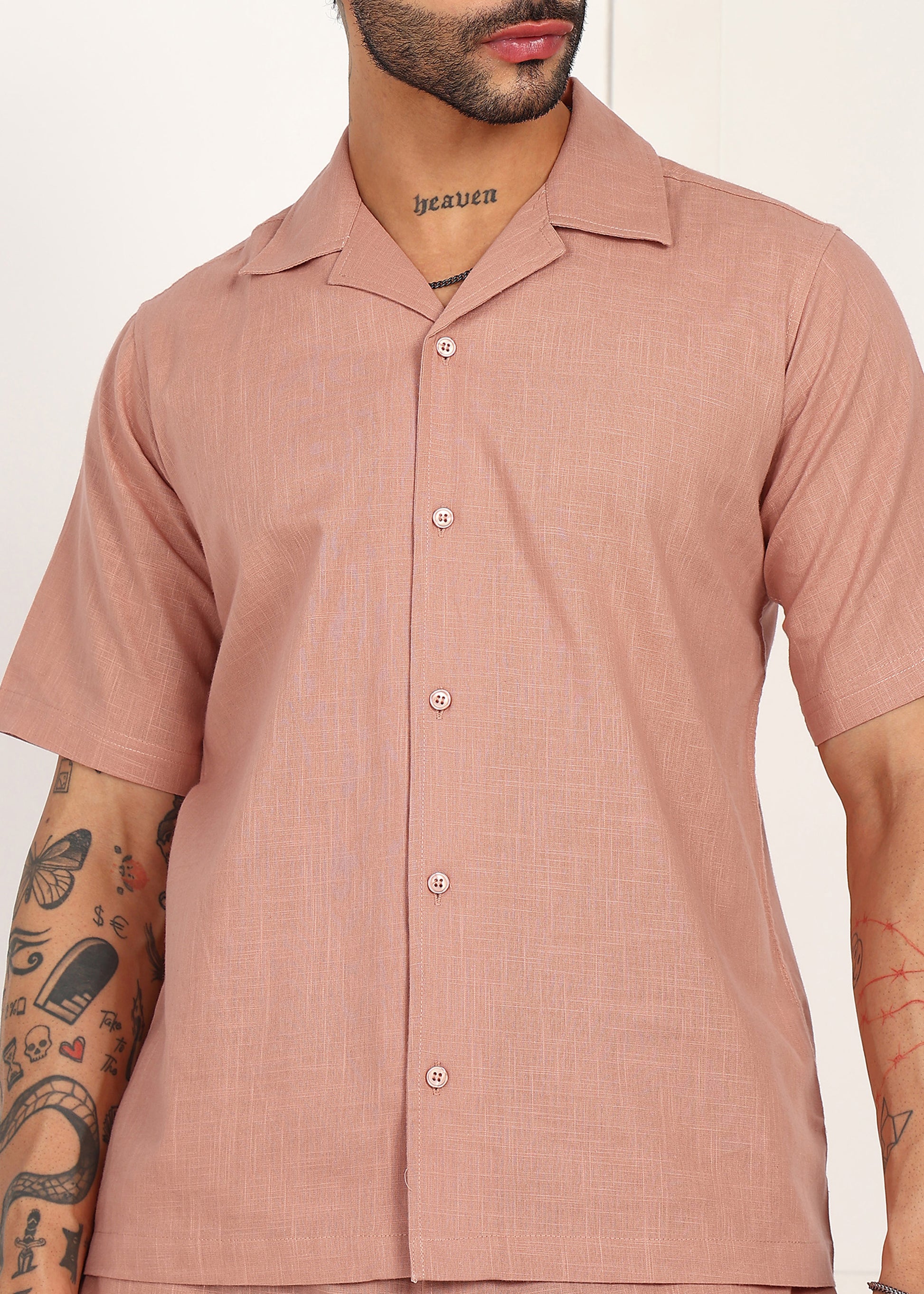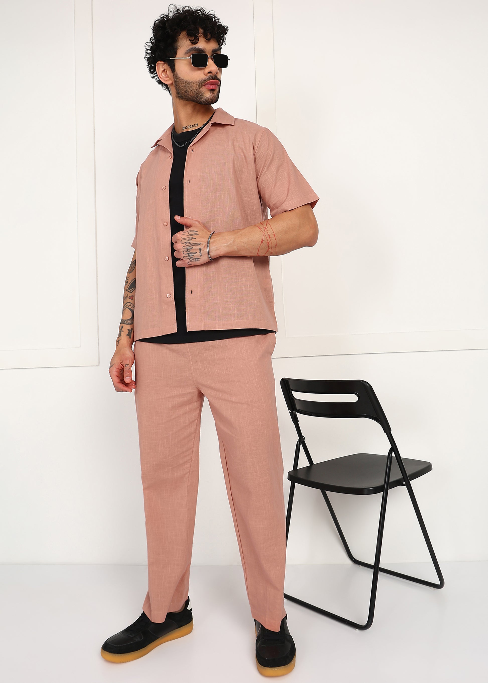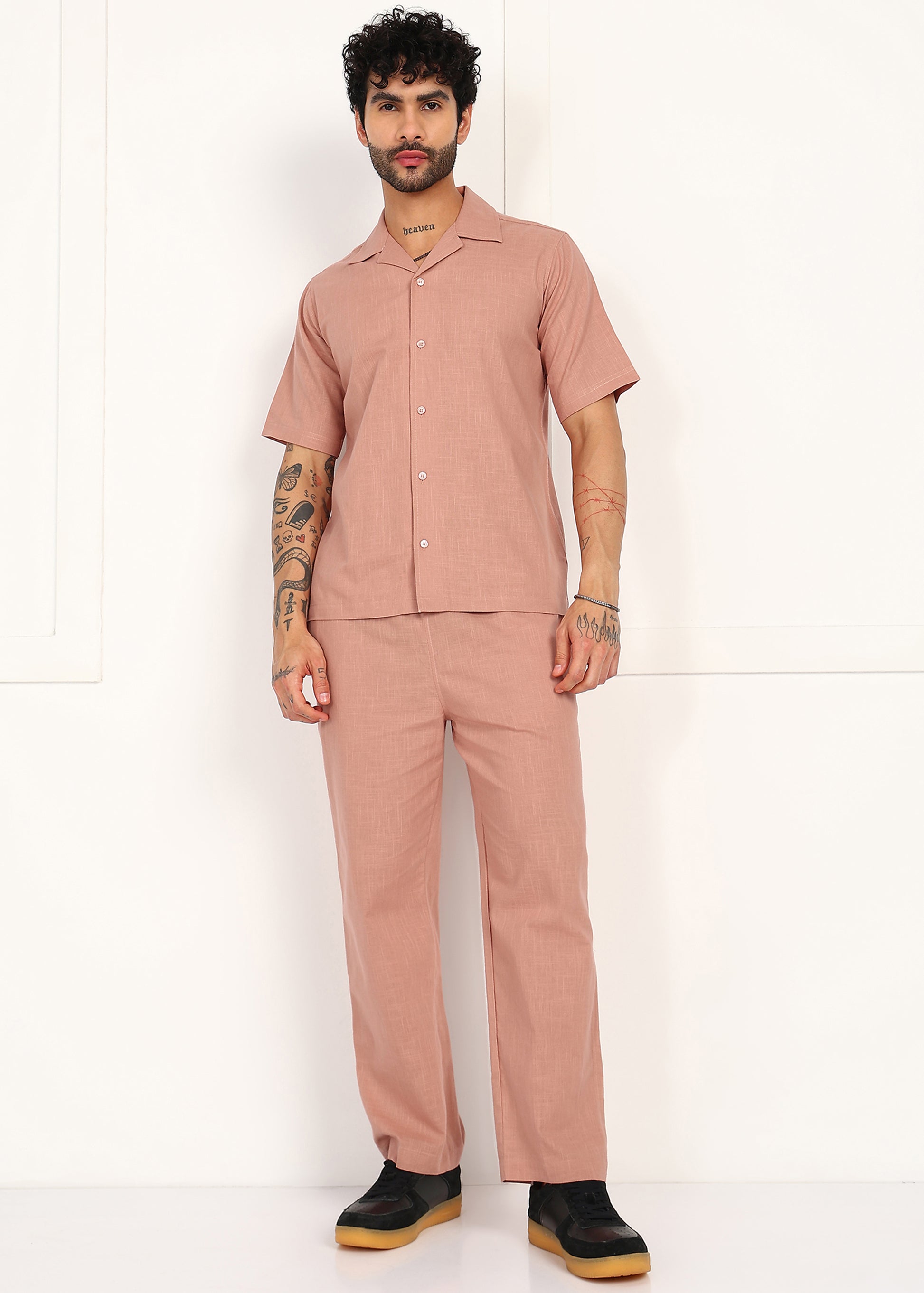 The short-sleeve shirt features a clean open collar and a relaxed silhouette, while the straight-fit trousers offer all-day ease with a minimal, tailored finish. The soft peach tone adds a refined yet fresh look, making this co-ord set versatile enough for casual wear, resort styling, or smart everyday dressing.