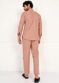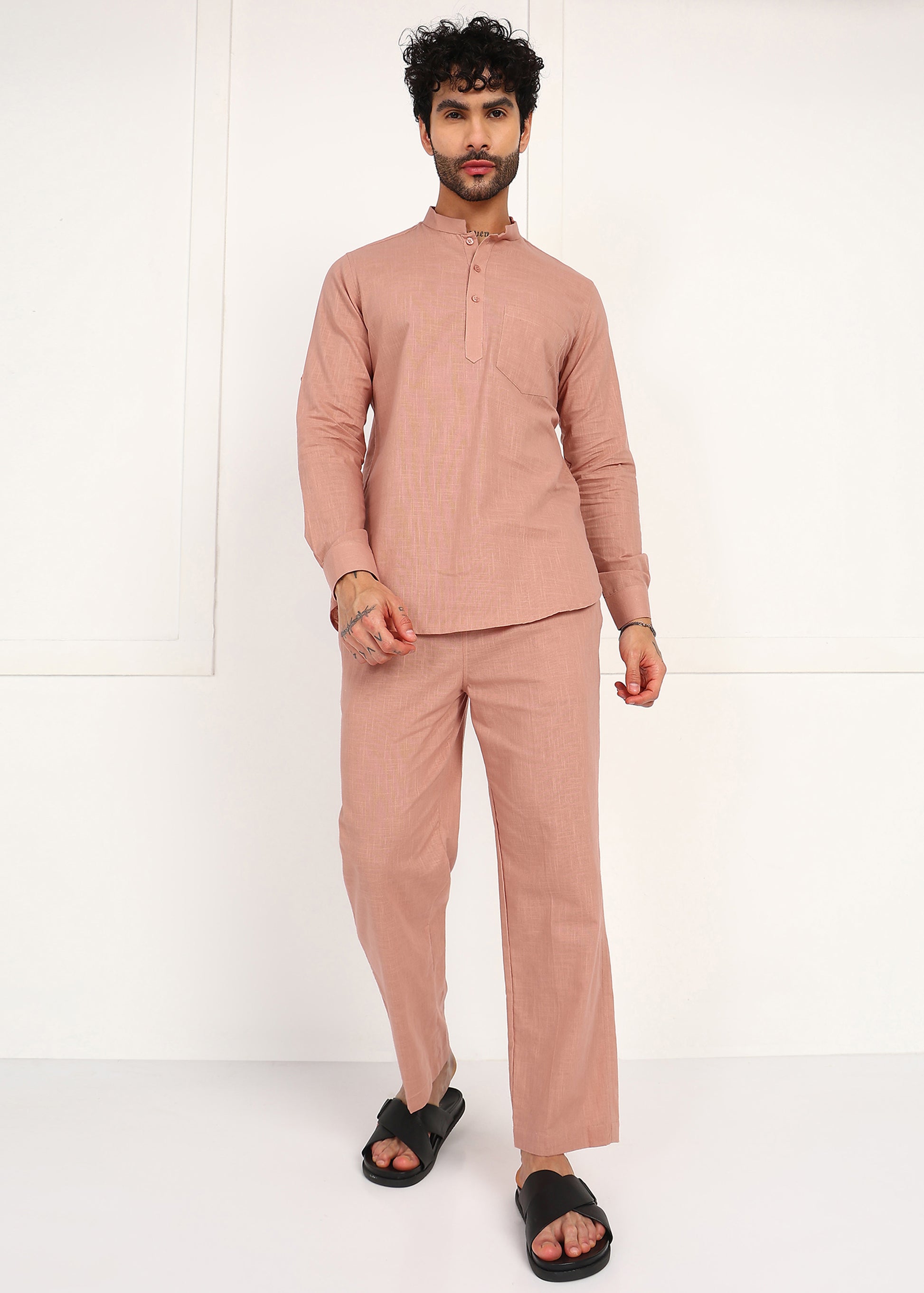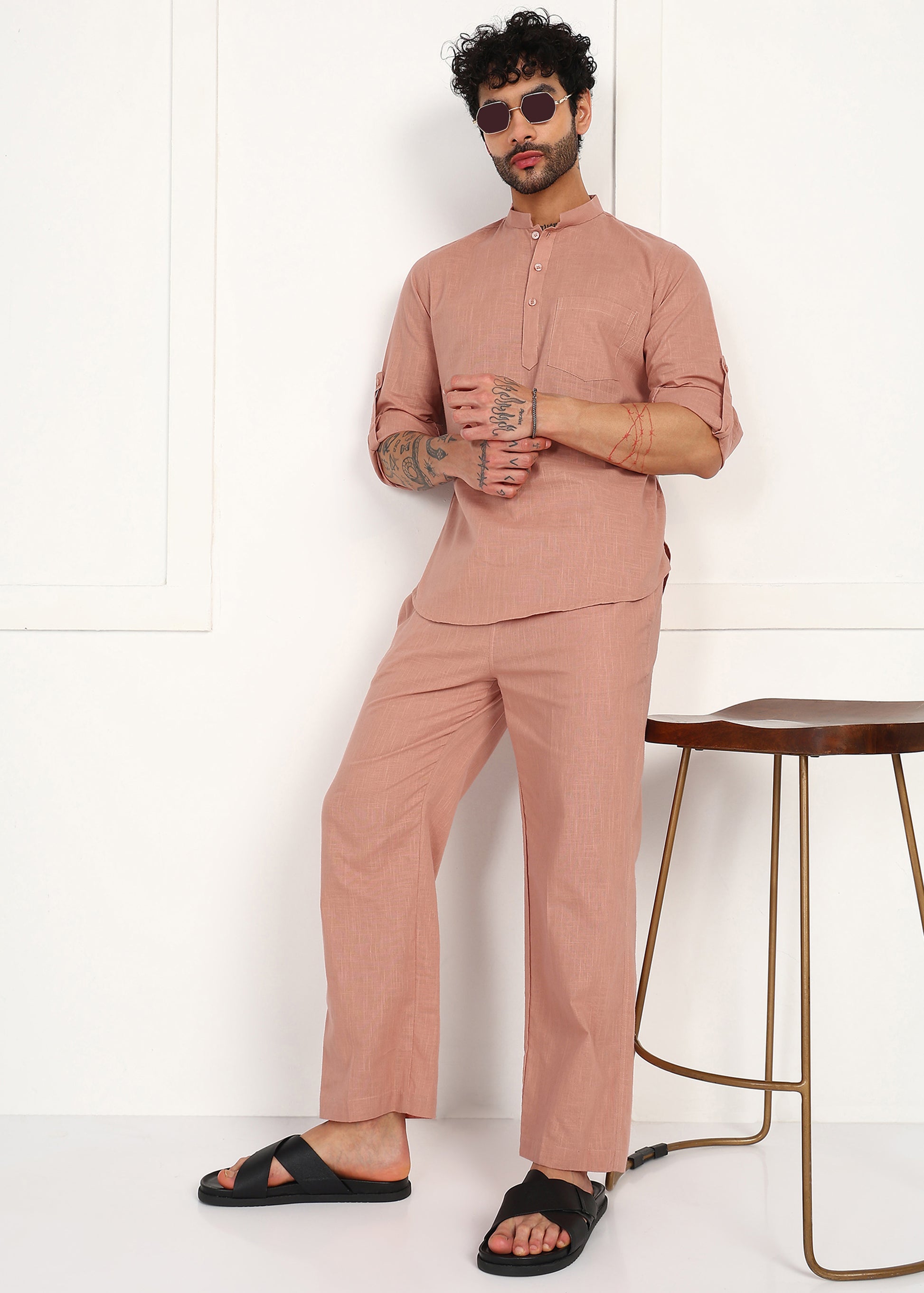 The short kurta features a clean silhouette with a minimal placket and contemporary cut, offering a perfect balance between traditional charm and modern styling. Paired with straight-fit trousers, the set ensures ease of movement and all-day comfort. The soft peach hue adds a refreshing, sophisticated touch, making it suitable for casual ethnic wear, daytime events, or travel-friendly styling.