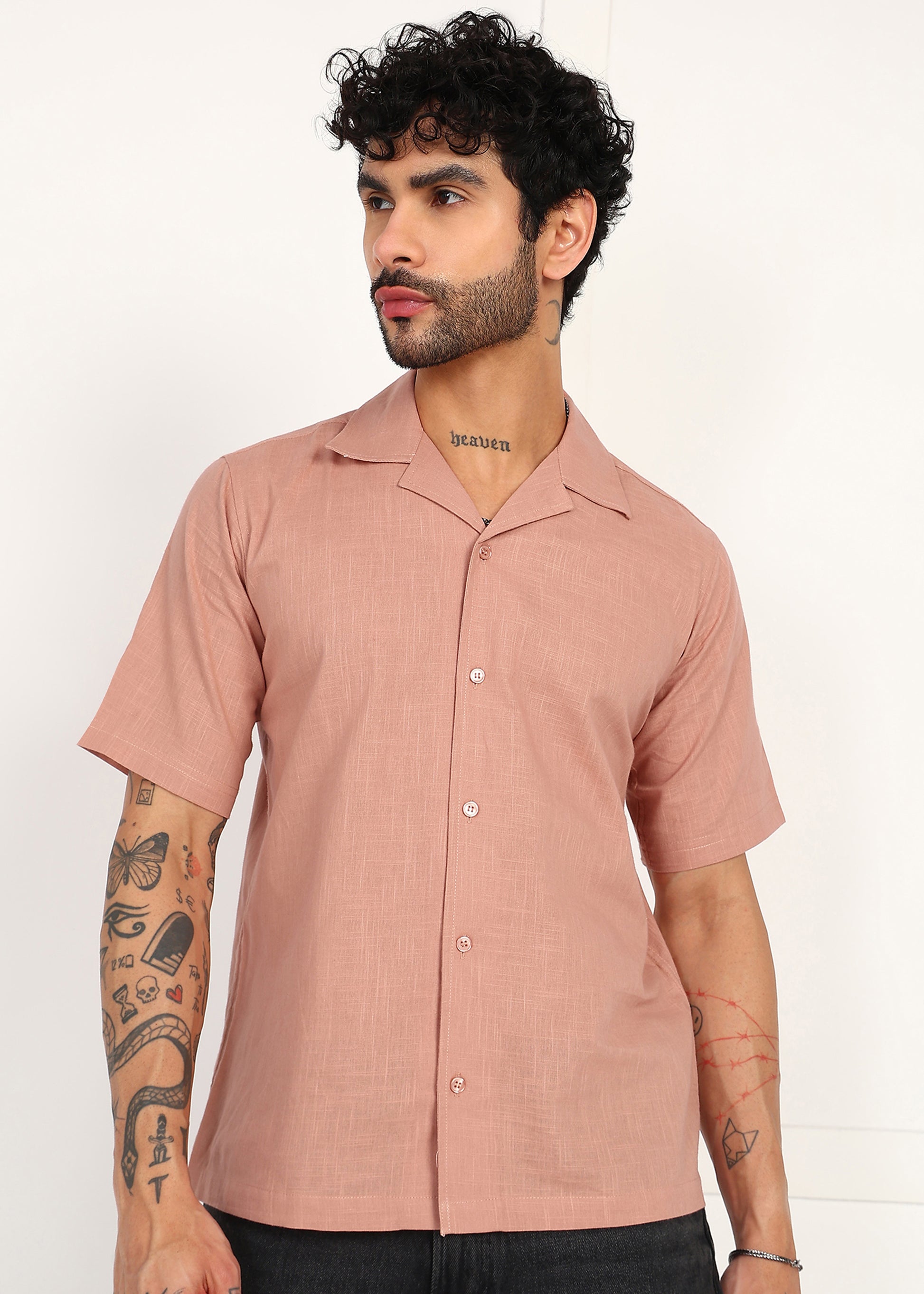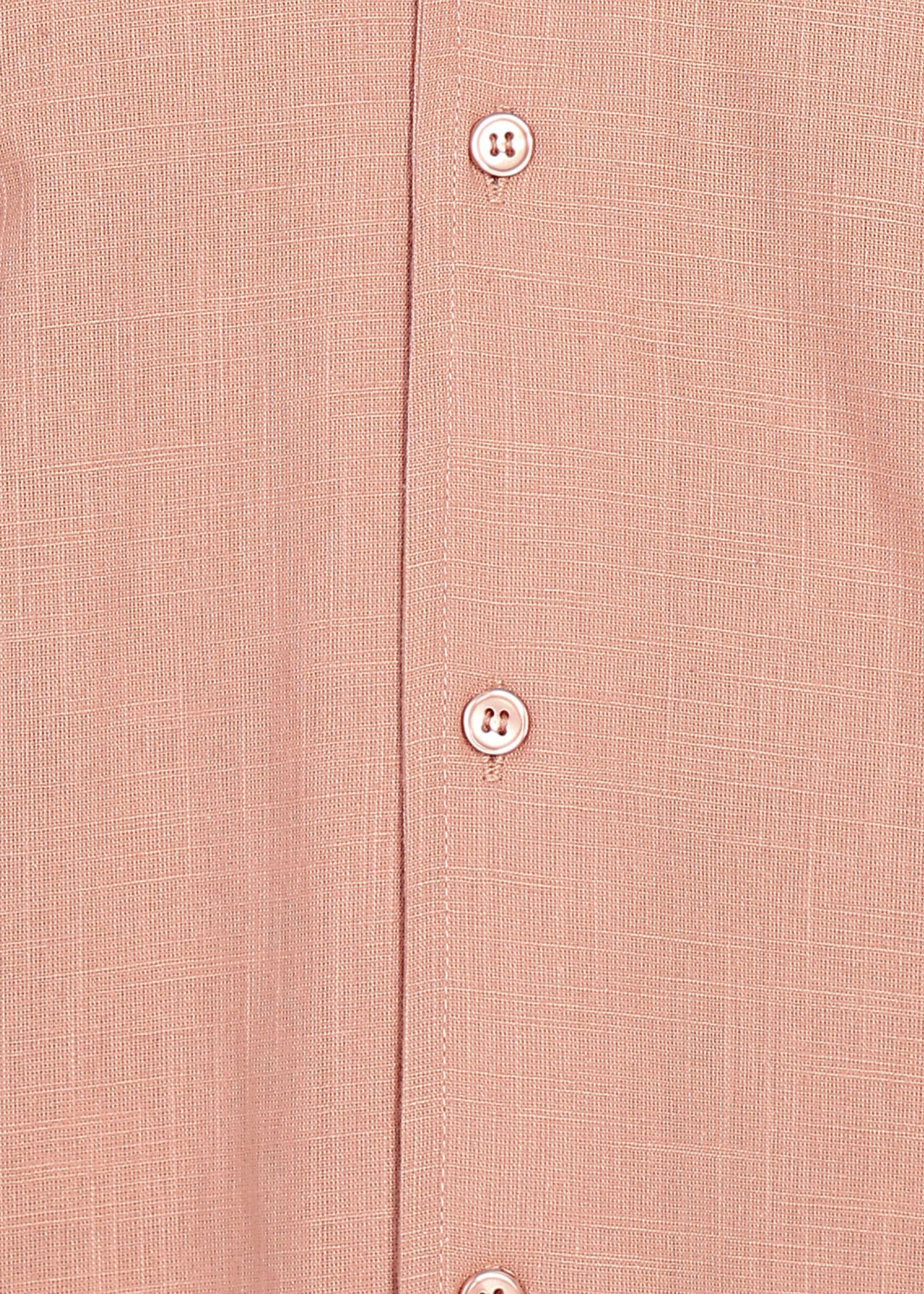 Featuring a classic open collar, button-down front, and a relaxed yet tailored fit, this shirt blends casual elegance with contemporary styling. The subtle peach tone adds a refined, fresh touch, making it easy to dress up or down.
