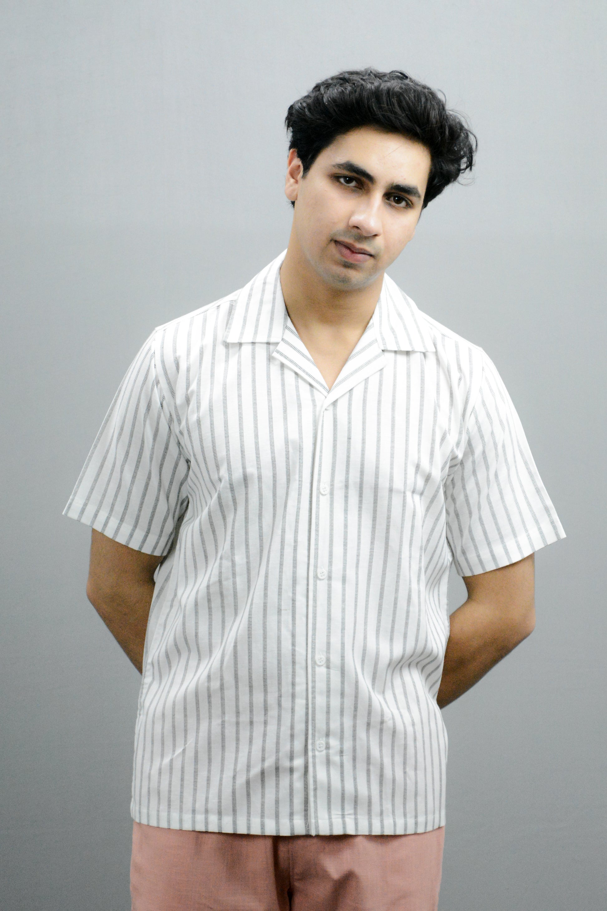 Add a touch of sophistication to your summer wardrobe with our men's white shirt with black stripes. Designed for those who appreciate both comfort and style, this shirt features a regular fit, half sleeves, and a classic resort collar—ideal for beach vacations, casual outings, or smart summer evenings.