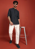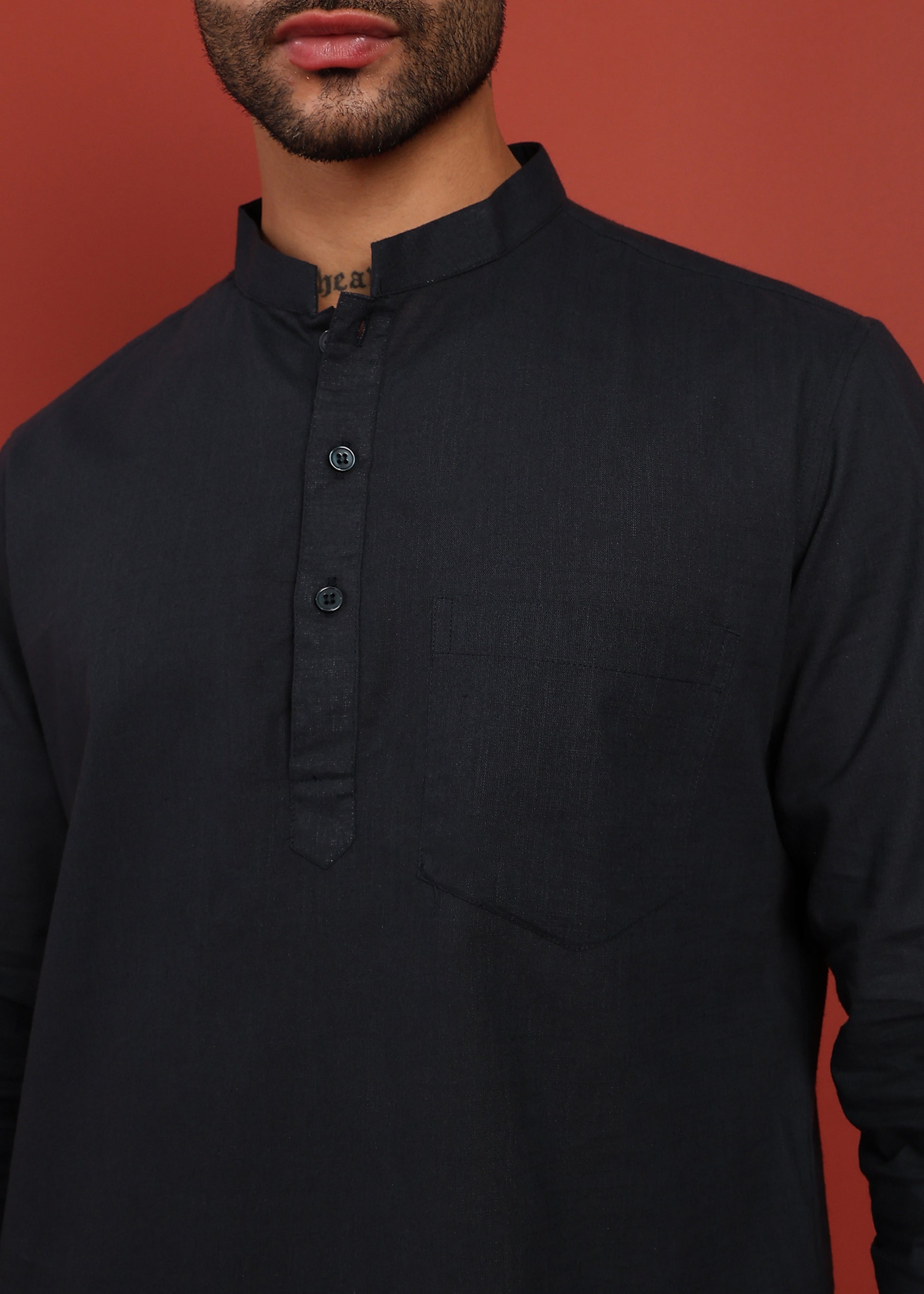 A refined essential for the modern man, the Onyx Noir Short Kurta features a clean mandarin collar, minimalist design, and breathable fabric for all-day comfort. Perfect for festive casuals, evenings, or everyday ethnic wear, this kurta pairs effortlessly with pyjamas, trousers, or shorts for a contemporary fusion look.