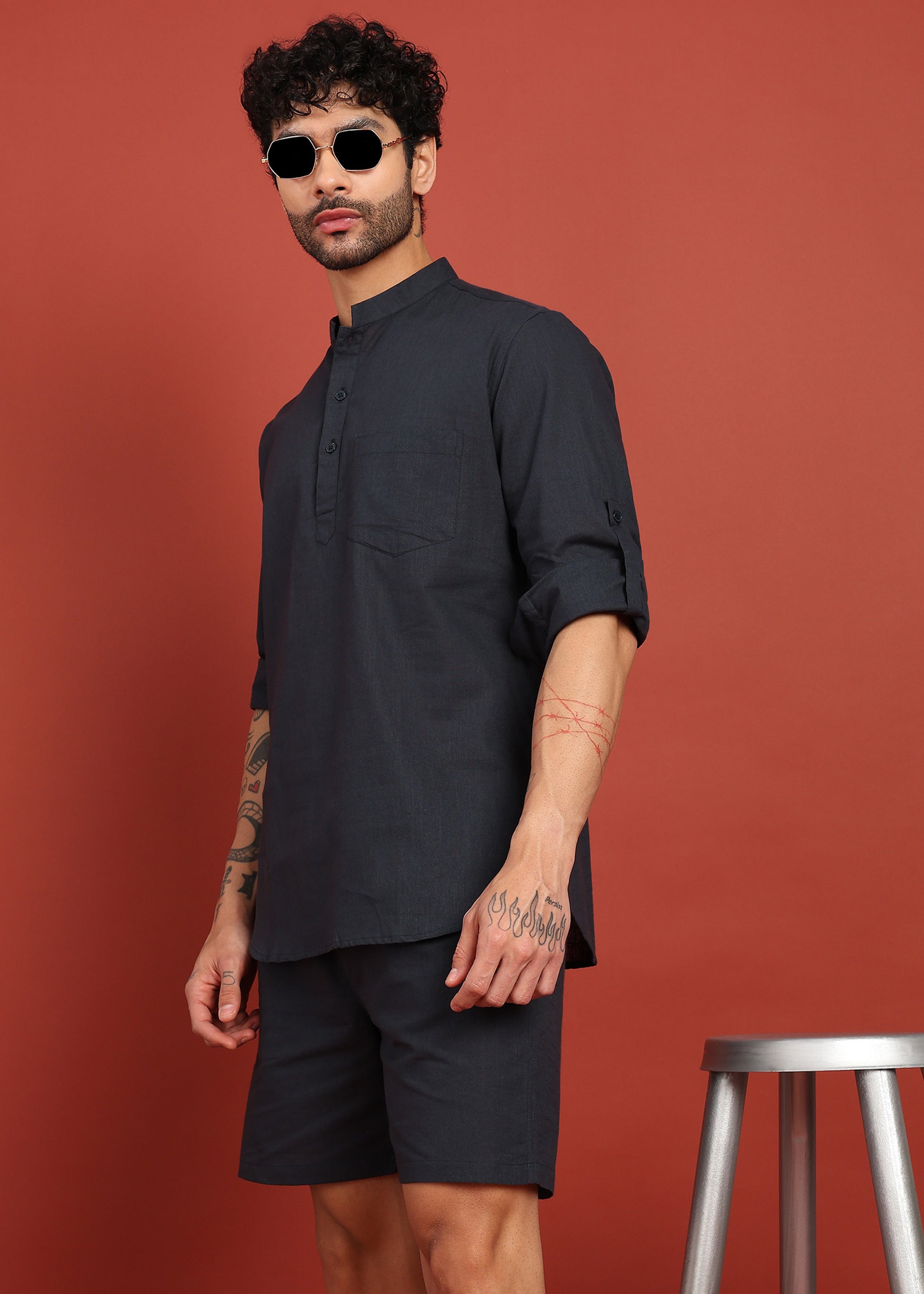 Sleek, minimal, and effortlessly modern — the Onyx Noir Short Kurta Co-Ord Set redefines contemporary ethnic wear. Featuring a sharp mandarin-collar short kurta paired with matching tailored shorts, this set blends traditional structure with relaxed summer comfort. Crafted from lightweight, breathable fabric, it’s ideal for festive casuals, evening outings, vacations, and modern ethnic styling.