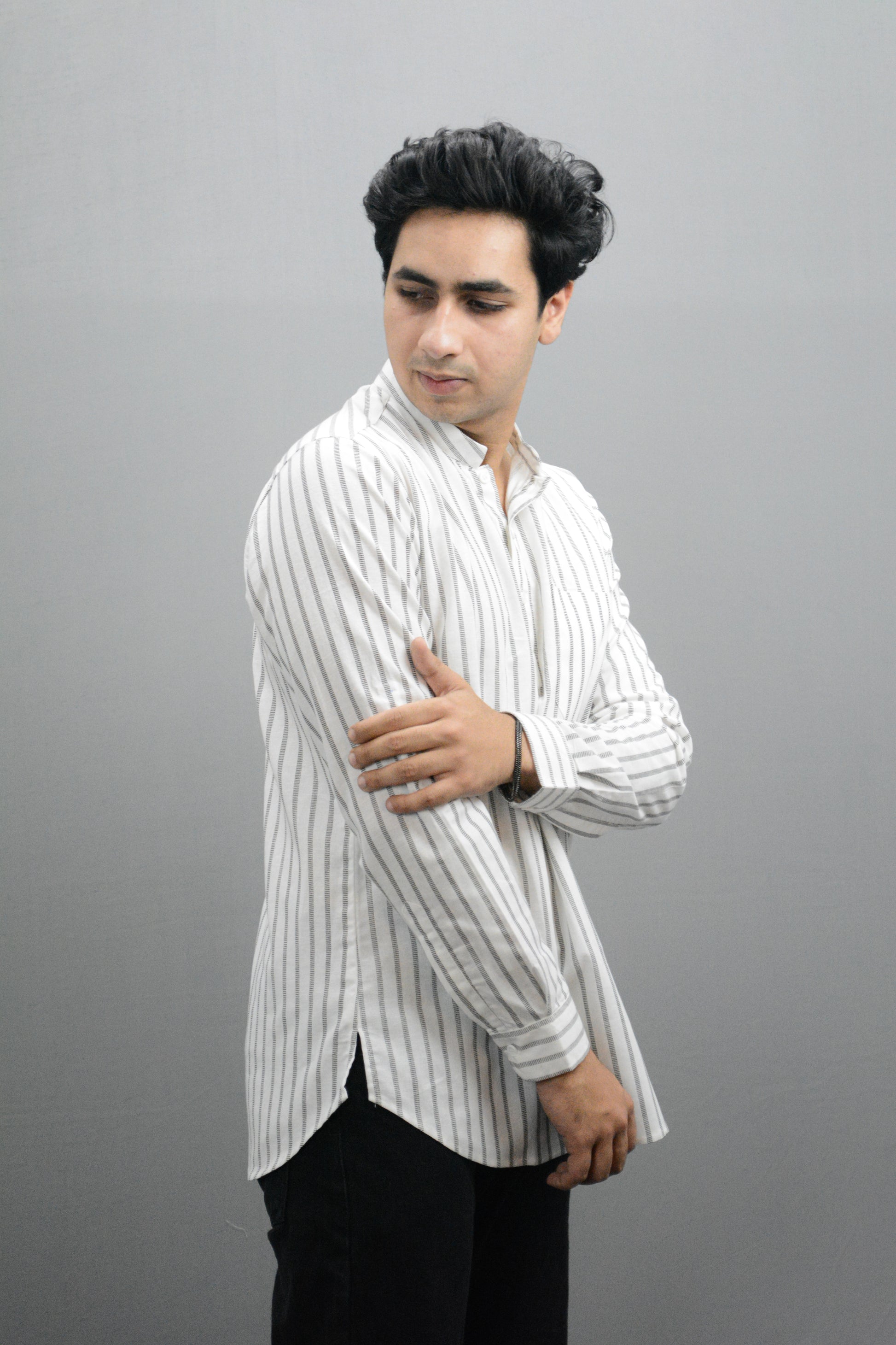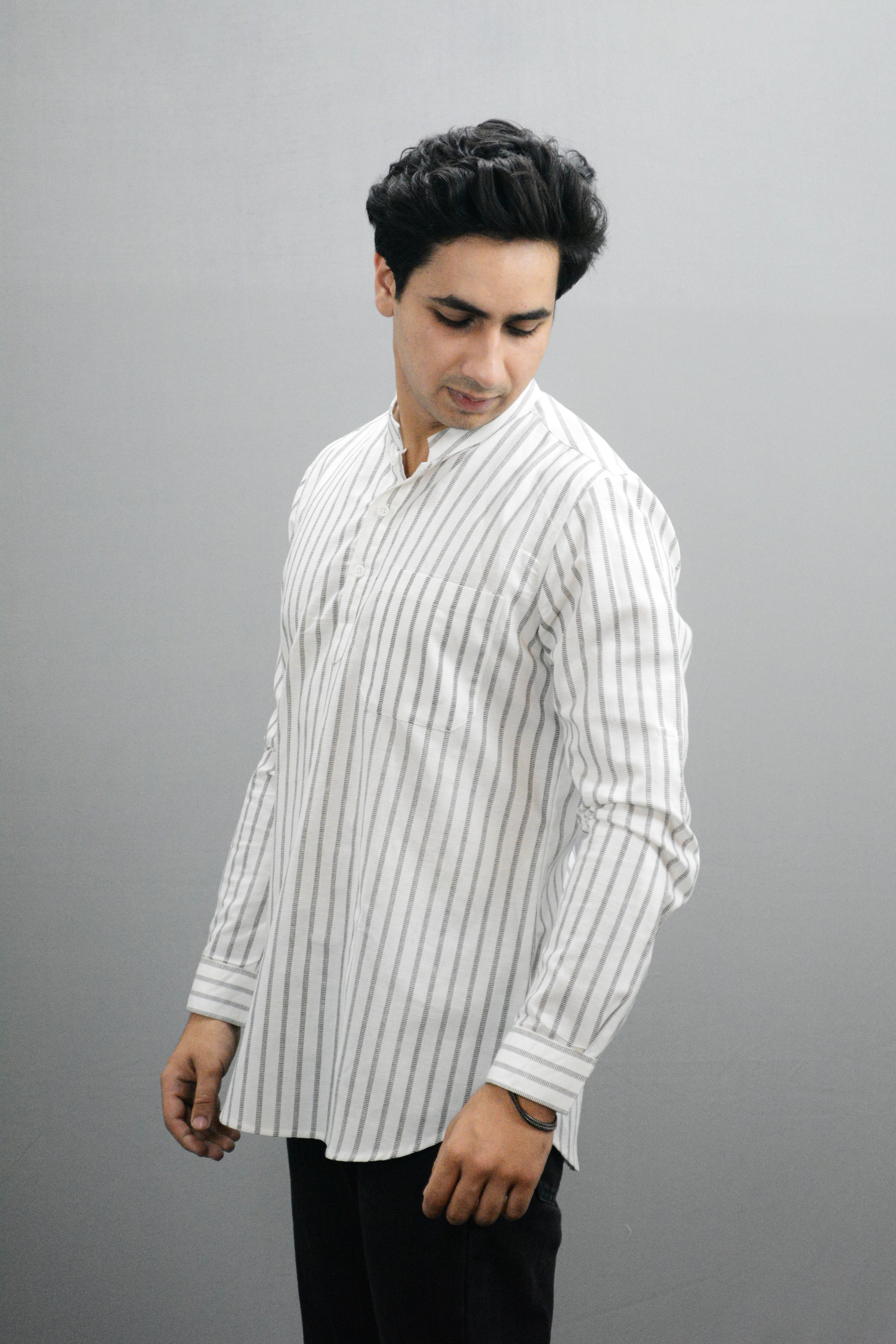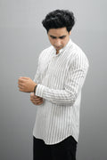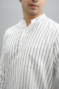 White Woven Striped Cotton Short Kurta